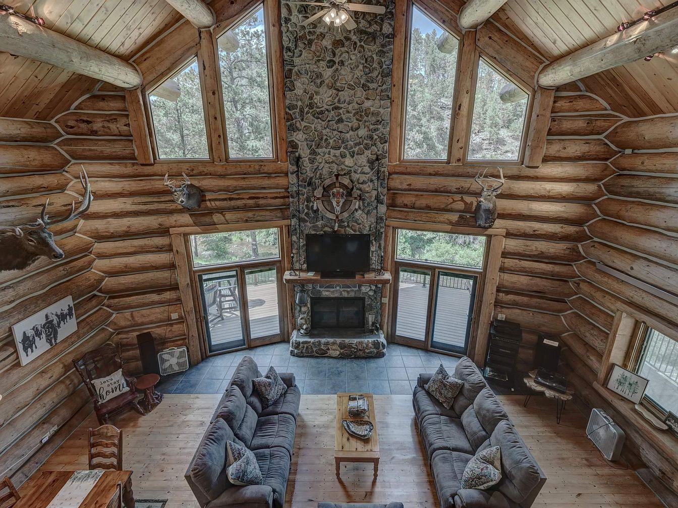 A grand, open-concept log cabin living room exudes warmth and rugged comfort with its towering timber walls, vaulted ceilings, and expansive windows that fill the space with natural light and scenic woodland views. The stone fireplace serves as a stunning focal point, adding cozy charm and gathering appeal, while the mounted antlers and wildlife-themed décor celebrate a love for the outdoors. Plush, family-friendly couches are arranged for conversation or relaxation, with abundant throw pillows for comfort. The natural wood surfaces and earthy color palette blend beautifully, offering a welcoming retreat where families can gather to enjoy leisure and togetherness.
