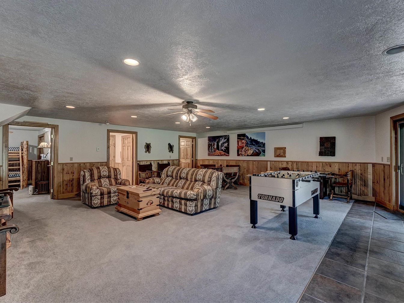 A spacious basement family room designed with recreation and comfort in mind, featuring plush, neutral carpeting and classic wood wainscoting for a warm, inviting atmosphere. The area includes a cozy seating arrangement with a striped sofa and matching chairs centered around a rustic wooden chest table. Family-friendly amenities such as a foosball table provide entertainment for kids and adults alike. Multiple doorways lead to what appears to be a bunk room and additional bedrooms, making this a hub for gatherings. Soft recessed lighting and a ceiling fan enhance the relaxed vibe, while artwork and wall decor add personality and charm.