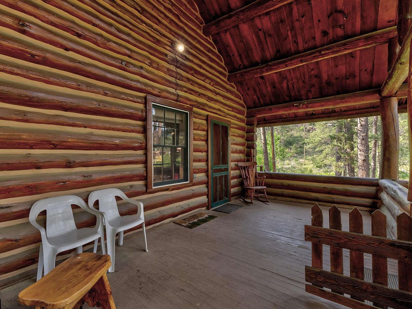 This welcoming porch showcases classic log cabin charm with natural logs lining the walls and overhead, creating a warm, earthy aesthetic. Family-friendly features include a secure wooden gate, offering peace of mind for families with young children or pets. The layout is spacious, providing ample seating with a pair of sturdy white armchairs, a rustic wooden side table, and a timeless rocking chair perfect for relaxing evenings. An inviting screened door and large window connect the outdoors to the cozy interior. The porch overlooks a tranquil wooded landscape, blending indoor comfort with the beauty of nature for gatherings or quiet reflection.