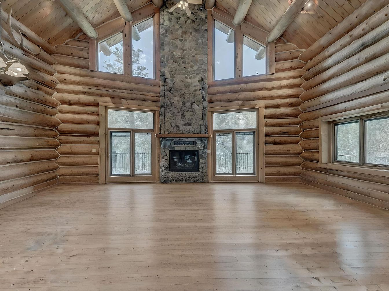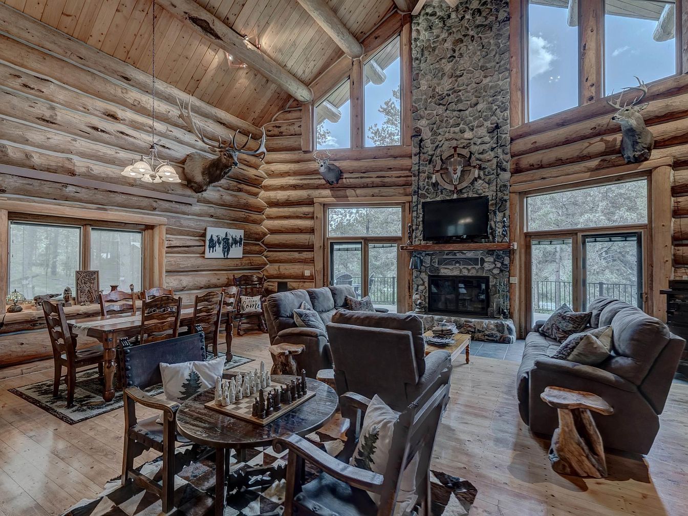 Spacious great room featuring a soaring cathedral ceiling and panoramic windows, allowing natural light to flood the space and connect the interior with nature. The log walls and exposed timber beams create a cozy, welcoming atmosphere ideal for family gatherings. A stunning stone fireplace serves as the heart of the room, perfect for relaxing on cool evenings. Light hardwood flooring complements the rustic yet modern aesthetic, while large glass doors provide seamless access to outdoor living areas, making the space ideal for entertaining or family activities. This inviting design seamlessly blends functionality with timeless mountain lodge charm.