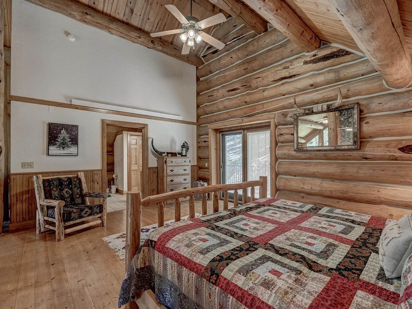 A cozy, family-friendly bedroom with warm log cabin architecture, exposed wood beams, and a captivating patchwork quilt on a sturdy wooden bed. Natural wood finishes cover the floor, walls, and ceiling, crafting a welcoming space that evokes a classic mountain lodge. A plush patterned armchair and timber dresser blend rustic charm with comfort, while a large glass door fills the room with natural light and offers easy outdoor access. Decorative touches like the horned mirror, wildlife art, and soft area rug create a relaxing, inviting atmosphere perfect for unwinding together in a peaceful woodland setting.
