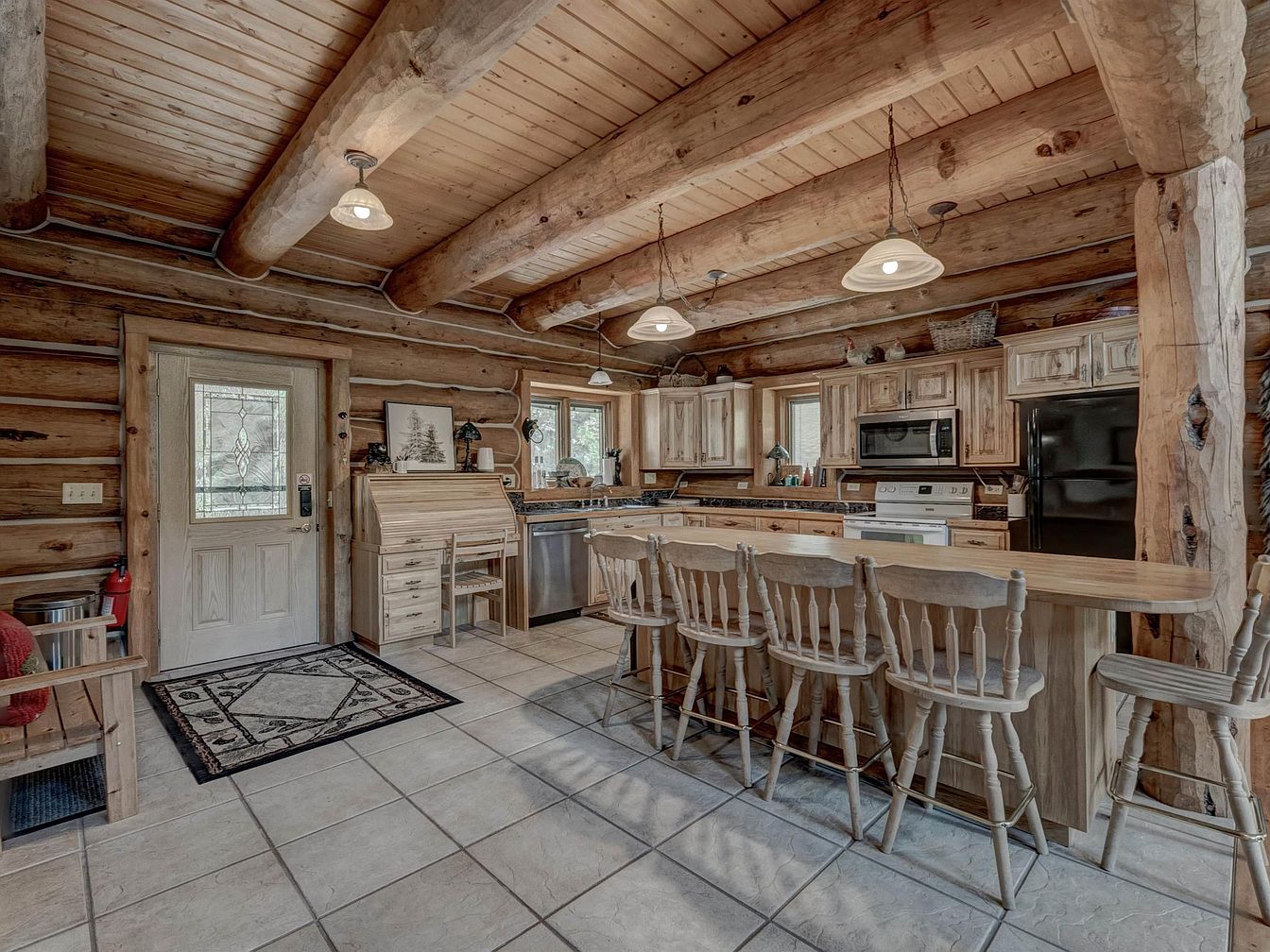 A spacious log cabin kitchen blends rugged charm with family functionality. Exposed timber beams and natural wood cabinetry exude warmth, complemented by soft, earthy tones throughout. Sleek appliances provide modern convenience, while a generous wooden island with seating for five invites shared meals and gatherings. Durable tiled flooring ensures practicality for busy family life, and large windows offer ample natural light. The entryway features an inviting workstation, making the space versatile for homework or daily planning. Thoughtful details, such as pendant lights and handcrafted details, create a cozy, welcoming area perfect for both cooking and connecting.