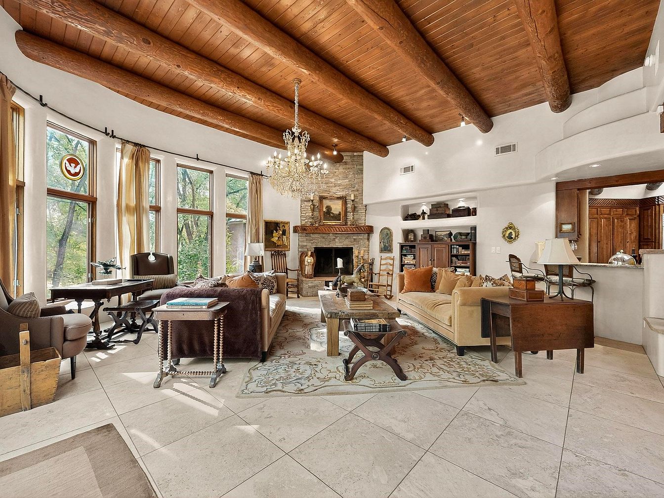 This expansive living room features soaring ceilings with exposed wooden beams, lending a rustic warmth that blends beautifully with the large picture windows, flooding the space with natural light and offering serene views of the surrounding greenery. A central stone fireplace anchors the room, framed by inviting sofas and eclectic mix of classic and cozy seating, ideal for family game nights or relaxed conversation. Built-in shelving and bespoke cabinetry offer practical storage and display, while a grand chandelier adds an elegant touch. The neutral palette, soft area rug, and wood accents create a harmonious atmosphere perfect for families and entertaining guests.
