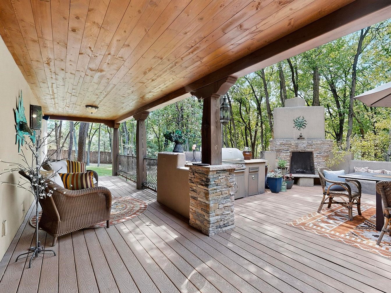 Warm natural wood tones define this spacious covered patio, creating a cozy yet sophisticated atmosphere for family gatherings or entertaining guests. The layout encourages indoor-outdoor living, with comfortable wicker seating and colorful cushions arranged for conversation. A large, elegant stone fireplace and integrated grill area invite cooking and al fresco dining adventures, while decorative rugs and potted plants add softness to the space. Overhead, the polished wood ceiling provides shelter from the elements, making this deck usable year-round. Surrounded by trees, this patio offers a serene retreat, perfectly tailored for relaxation, family activities, and memorable evenings under the stars.