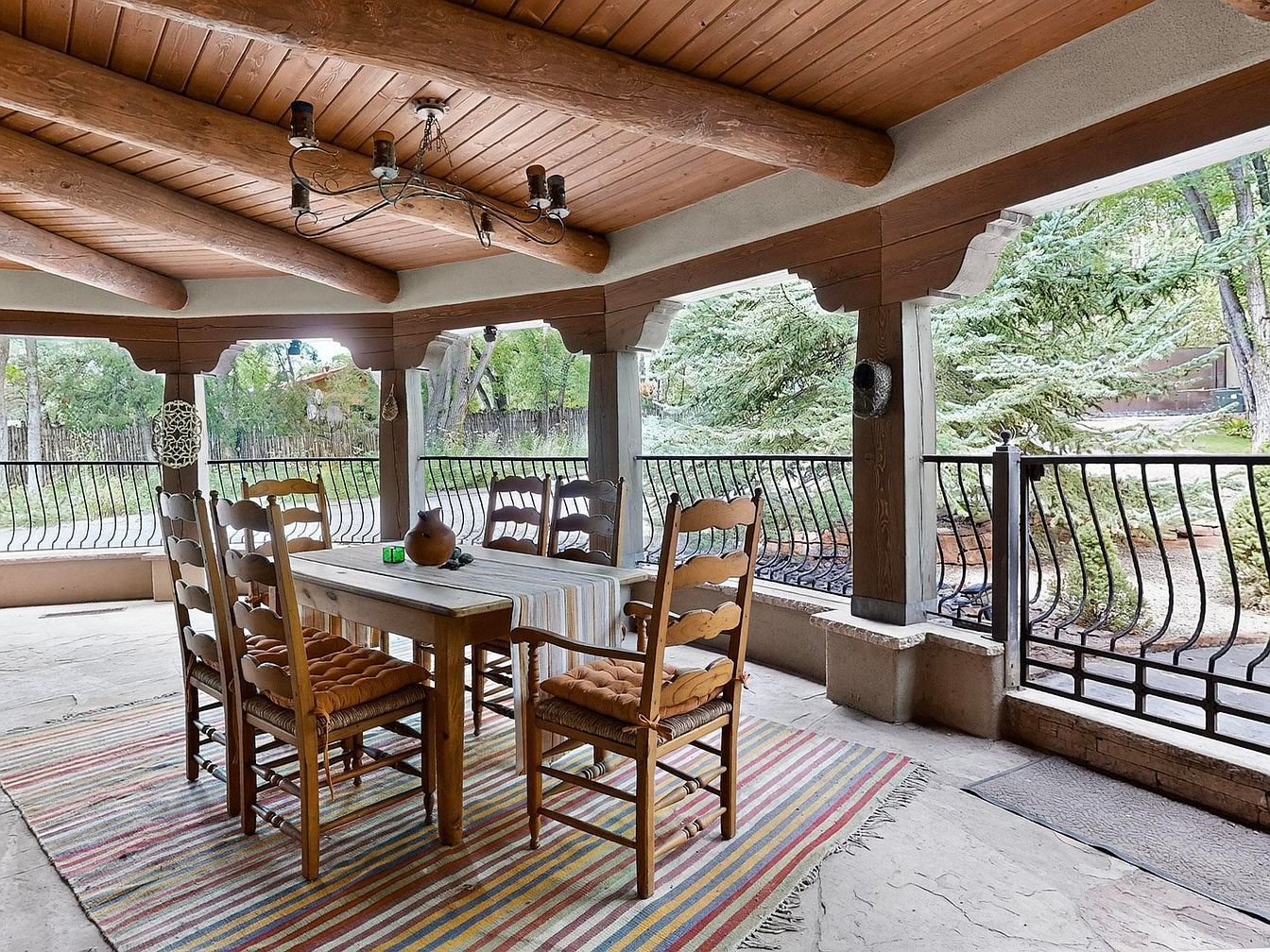 This inviting covered patio features a rustic wooden dining table surrounded by ladder-back chairs with soft, earth-toned cushions, making it ideal for family meals or entertaining guests outdoors. The wooden ceiling beams and stucco columns create a warm, Southwestern feel, while the wrought-iron railing adds both safety and style, making the space practical for households with children. A striped area rug brings a cheerful burst of color and texture to the stone floor, complementing the natural surroundings. Large, open arches frame serene views of greenery, blending indoor comfort with outdoor beauty for a welcoming, family-friendly gathering spot.