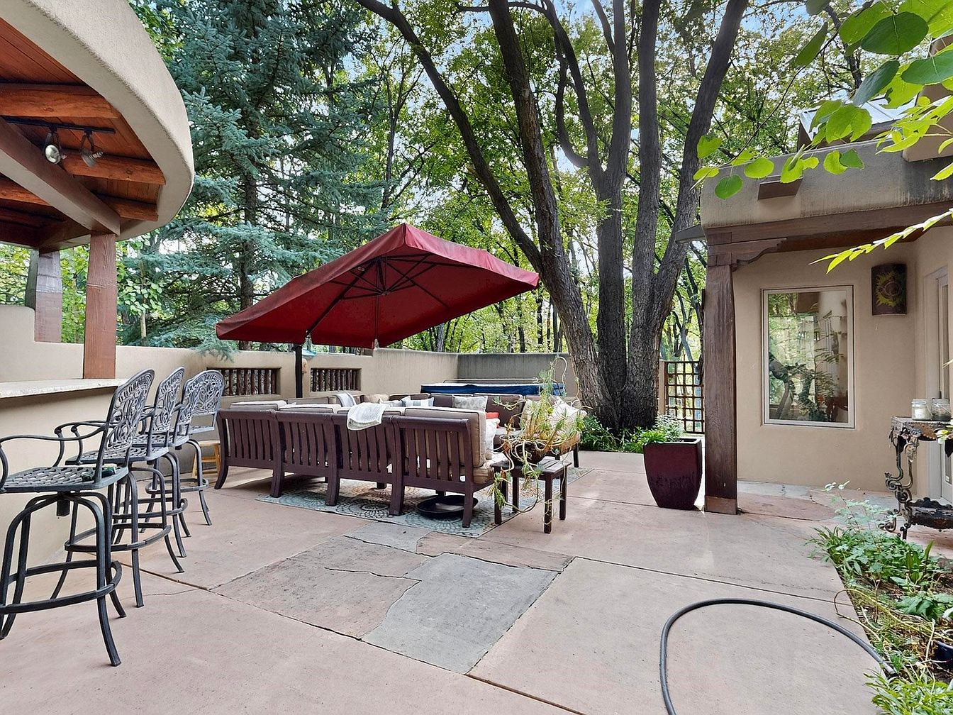 Spacious outdoor patio blends seamlessly with nature, shaded by mature trees and featuring a comfortable seating area with wooden furniture arranged around a central table, perfect for gatherings and family activities. The large red umbrella offers both shade and a cheerful pop of color, while the natural stone flooring enhances the earthy, Southwestern aesthetic. A bar counter with wrought iron stools adds a place for casual meals or conversation, ideal for entertaining. Earth-toned stucco walls, rustic wooden beams, and potted plants complete the setting, making this a family-friendly oasis for relaxation and play in a tranquil garden atmosphere.