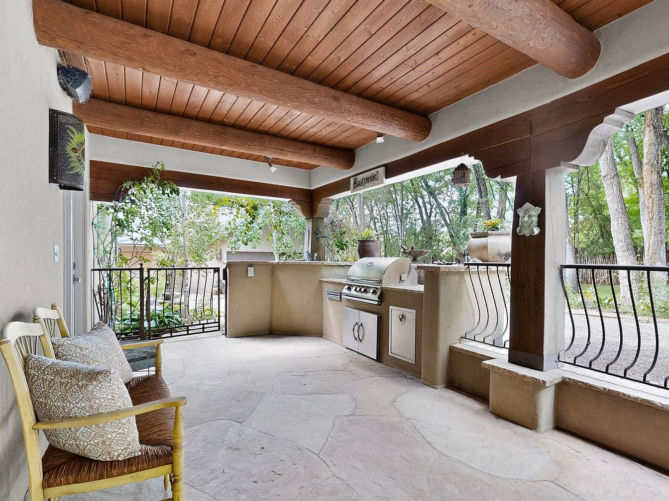 This spacious outdoor kitchen patio blends rustic charm with functional family-friendly features. Large wooden ceiling beams and textured stone flooring create a warm, inviting atmosphere, while stucco columns and wrought iron railings add Southwest character. The central focus is a built-in grill and prep area, perfect for gatherings and summer barbecues. Comfortable cushioned chairs provide a relaxing seating option, making it ideal for supervising children at play or enjoying casual meals. Lush greenery and potted plants bring the outdoors in, while neutral earth tones combined with natural materials give the space a harmonious, timeless appeal, easily accommodating family activities and socializing.