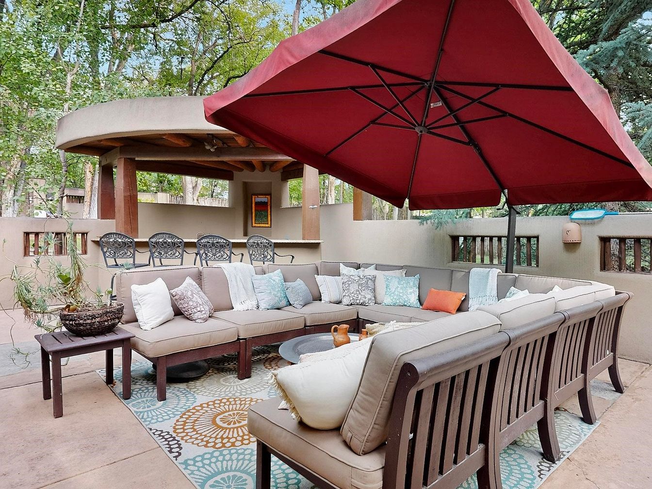 A spacious patio invites family gatherings with its generous L-shaped sectional sofa set on a patterned outdoor rug. Neutral beige upholstery accented with assorted pastel and earth-tone pillows adds comfort and warmth, while a large red umbrella provides ample shade for sunny days. Behind the seating area, a curved stucco bar with ornate metal stools and exposed wood beams suggests effortless indoor-outdoor entertaining. Earthy architectural elements blend gracefully with lush green trees and soft landscaping, creating a tranquil and private ambiance ideal for both adults and children to relax or socialize in a stylish, inviting environment.