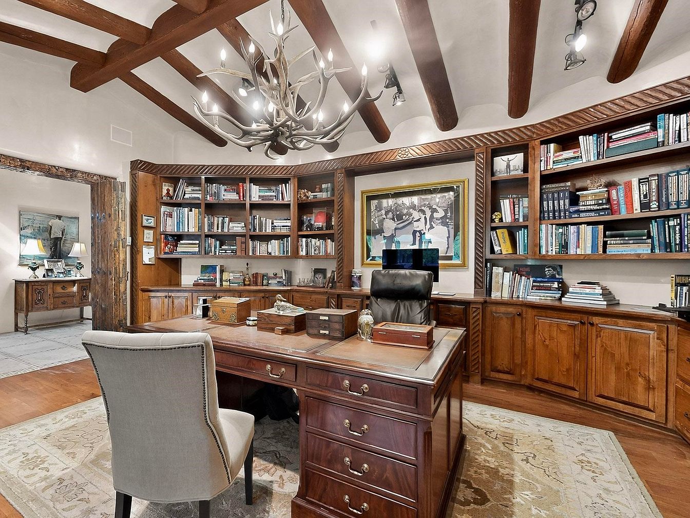 A spacious home office blends traditional charm with functionality, featuring extensive built-in wooden bookshelves filled with books and collectibles, creating a cozy and inviting workspace. The centerpiece is a substantial wooden desk set atop a patterned area rug, paired with both a plush high-back office chair and an upholstered guest chair for collaboration. Exposed wooden ceiling beams and an antler-inspired chandelier add rustic elegance, while ample natural wood tones bring warmth to the room. This family-friendly space provides a quiet area for work, study, or family reading, with thoughtful organization making it ideal for professional and personal pursuits alike.