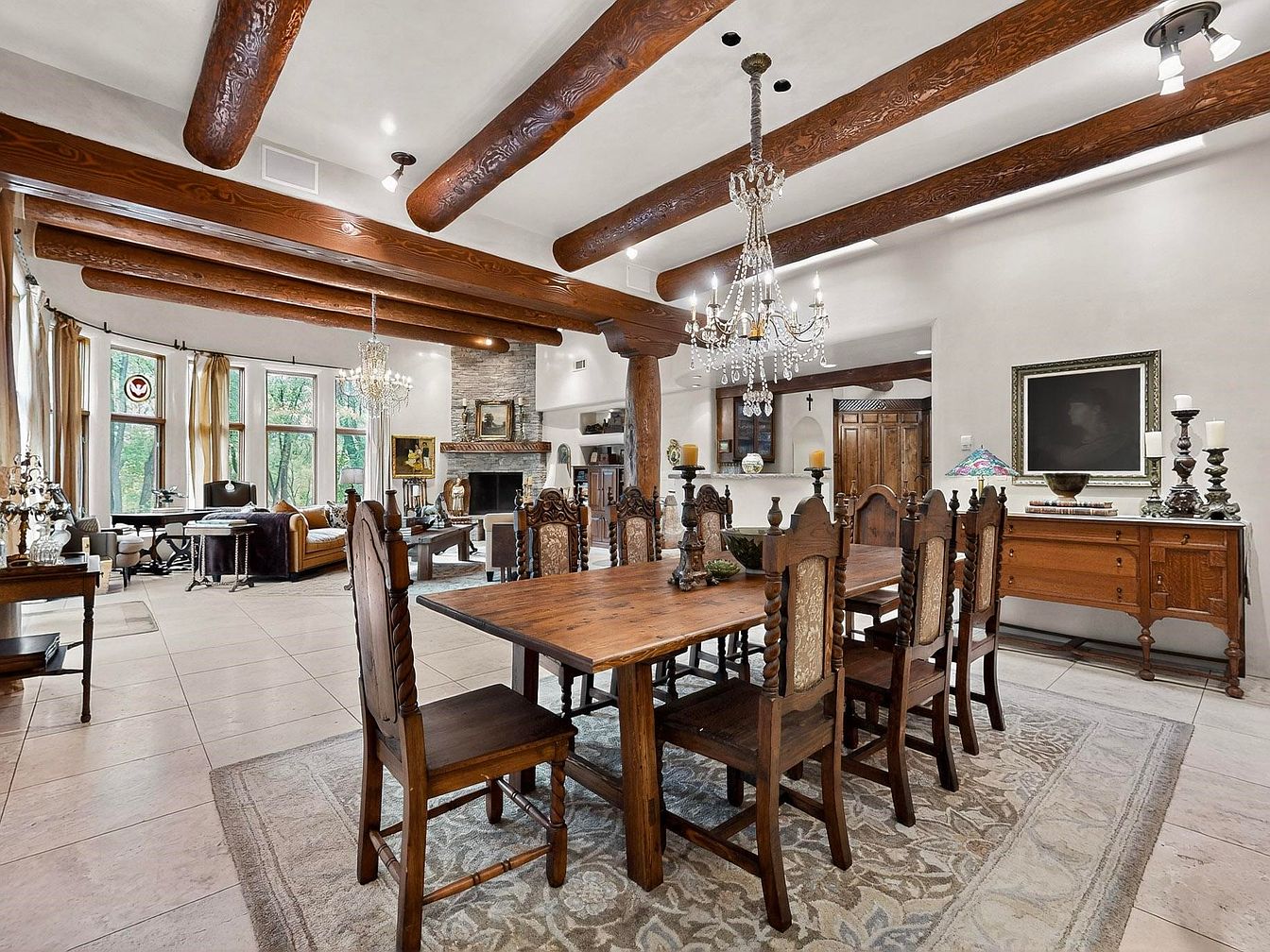 This spacious open-plan dining and living area seamlessly blends rustic charm with elegant touches, perfect for both lively family gatherings and quiet evenings. Exposed wooden ceiling beams and a grand chandelier create a sense of warmth and sophistication, while large windows bathe the room in natural light and offer sweeping views of greenery. A long wooden dining table and intricately carved chairs add vintage character, with a soft area rug anchoring the space. The living area features comfortable seating paired with a stone fireplace, inviting relaxation. Neutral wall colors, earth-toned furniture, and curated décor foster a welcoming, family-friendly atmosphere.