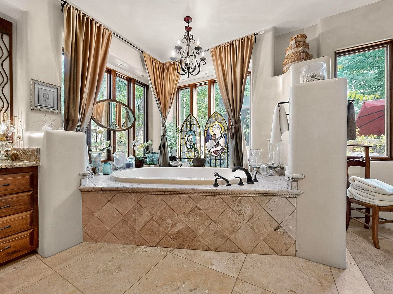 A luxurious bathroom oasis designed for relaxation, this space features a centrally placed soaking tub set in elegant stone tile with oil-rubbed bronze fixtures. Floor-to-ceiling windows wrap around the bath, draped with warm gold curtains for privacy and a touch of sophistication. The neutral color palette of creamy walls and beige tiles creates a calming atmosphere, complemented by the abundance of natural light. Thoughtful details include built-in shelves for fresh towels, family-friendly décor accents like stained glass art, and a chandelier overhead. Ample counter space and cabinetry offer functionality, making the space both practical and welcoming for family use.