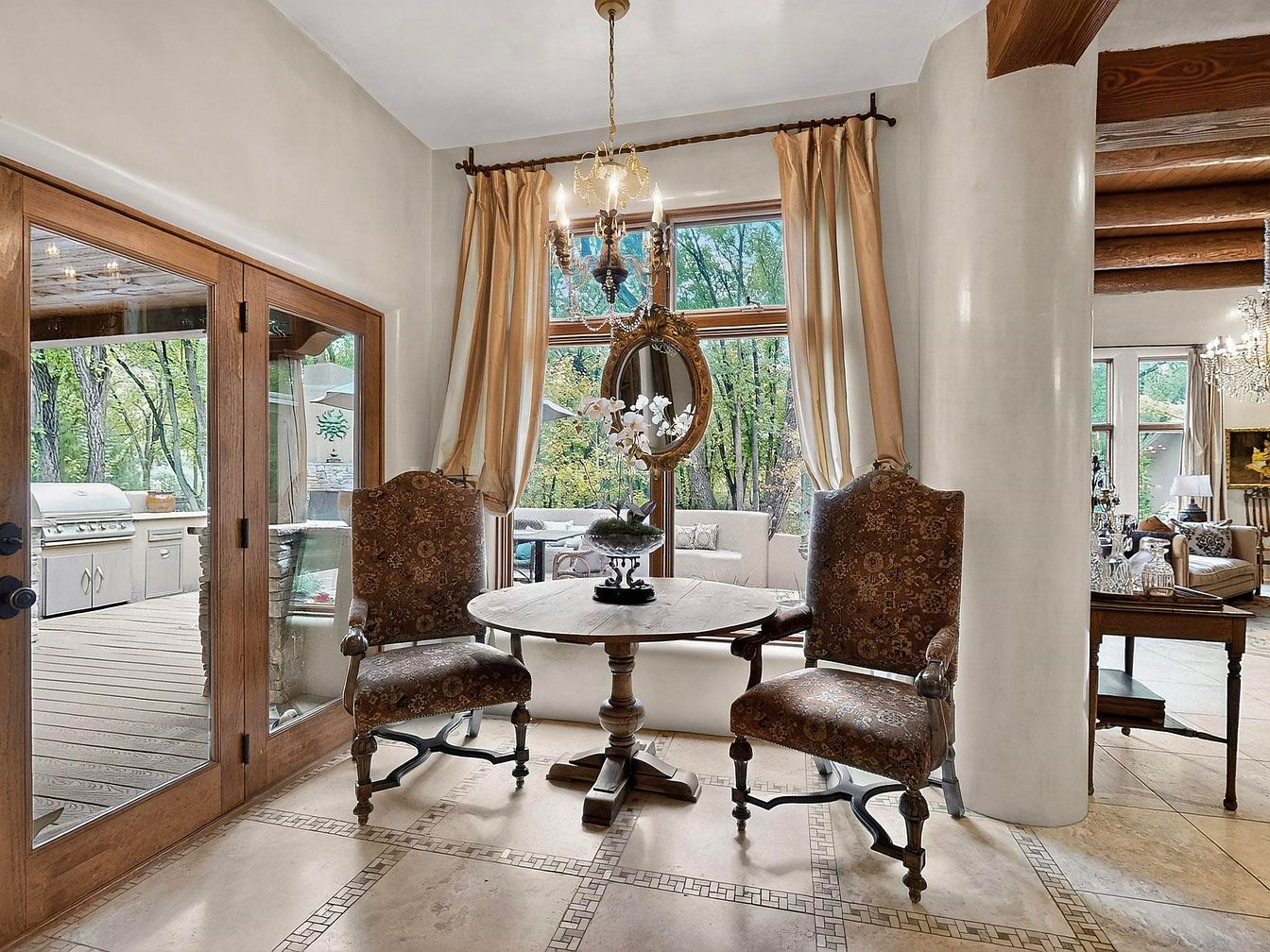 A charming breakfast nook is nestled beside large windows, inviting natural light and offering serene views of the tree-lined backyard. French doors open to a spacious deck with a built-in grill, seamlessly blending indoor and outdoor living. The space features a round wooden pedestal table paired with two ornate, upholstered chairs, perfect for casual family meals or quiet morning coffee. Warm beige tiles with intricate bordering complement the rustic wood beams and creamy walls. The area feels welcoming and practical for families, facilitating easy movement between dining, outdoor entertaining, and the adjacent cozy living room.