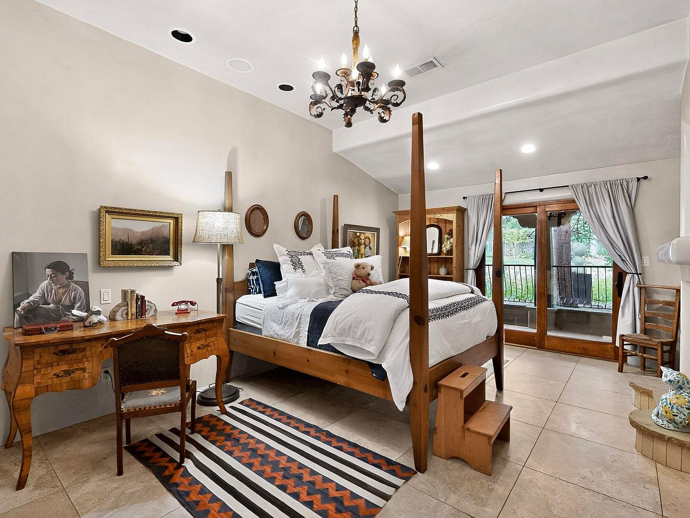 A spacious master bedroom exudes warmth and comfort with its neutral-toned walls and soft tile flooring. The room features a striking four-poster bed piled with luxe pillows, a cozy stepping stool, and a plush teddy bear, adding a family-friendly touch. Antique wooden furniture, including a writing desk and a statement wardrobe, create an inviting and functional corner for relaxation or study. Large windows and French doors, adorned with classic gray drapery, flood the space with natural light and provide access to a charming balcony, seamlessly merging the indoors with serene outdoor views. Unique art and a classic chandelier add personality and elegance.