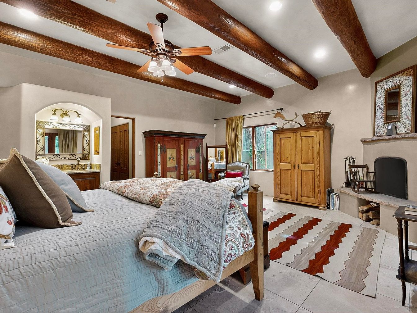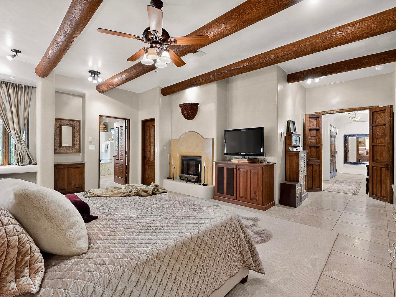 Spacious master bedroom showcases warm neutral tones and rustic wooden ceiling beams, creating an inviting Southwestern charm. The room features a generous bed with plush, textured bedding, complemented by soft throw pillows for ultimate comfort. A cozy fireplace serves as the focal point, flanked by a built-in media cabinet and storage cabinetry, offering family-friendly organization. Large windows with flowing drapes bathe the room in natural light, while tile flooring and an area rug add practicality and comfort underfoot. Thoughtful architectural details like arched walkways, wooden doors, and alcoves create a serene environment perfect for relaxation and family living.