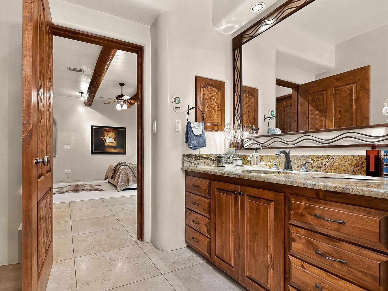Warm wood cabinetry and richly patterned granite countertops bring a welcoming, rustic touch to this spacious bathroom vanity area. The dual sinks and broad mirror provide functional elegance, catering well to busy family routines. Natural light bounces off the creamy tile flooring and soft-toned walls, creating a bright, inviting atmosphere. Subtle decorative flourishes, like the wavy trim on the mirror frame and artful door carvings, highlight craftsmanship. The open doorway leads seamlessly to a cozy bedroom with exposed beam accents and plush textiles, signaling a harmonious flow between relaxing personal spaces in this family-friendly home.
