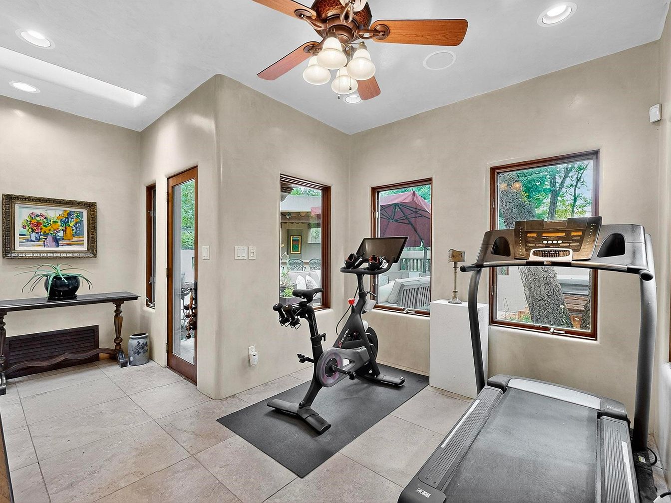 Bright and welcoming, this home gym area features large windows that offer lovely outdoor views and let in plenty of natural light, creating an energizing workout space. The neutral tile flooring and soft beige walls maintain a calm, family-friendly atmosphere, while a ceiling fan overhead ensures comfort. A treadmill and stationary bike are set on protective mats, catering to both individual fitness routines and shared family workouts. Decorative touches like a framed floral painting and an elegant console table with a potted plant add warmth and personality, blending the functionality of a gym with the coziness of a home.