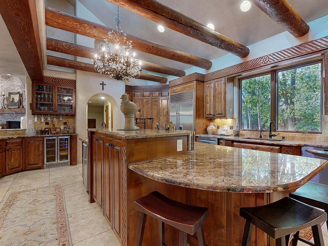 Warm wood cabinetry and striking log ceiling beams set a welcoming tone in this spacious kitchen, where a large granite-topped island anchors the space and invites family gatherings. Expansive windows offer tranquil wooded views and bathe the room in natural light, while a luxurious chandelier adds a touch of elegance overhead. The kitchen is equipped with energy-efficient stainless steel appliances, a built-in wine fridge, ample storage, and an open layout ideal for both everyday meals and entertaining. Neutral tiled floors, subtle decorative molding, and thoughtful seating options create a family-friendly environment blending style and function.