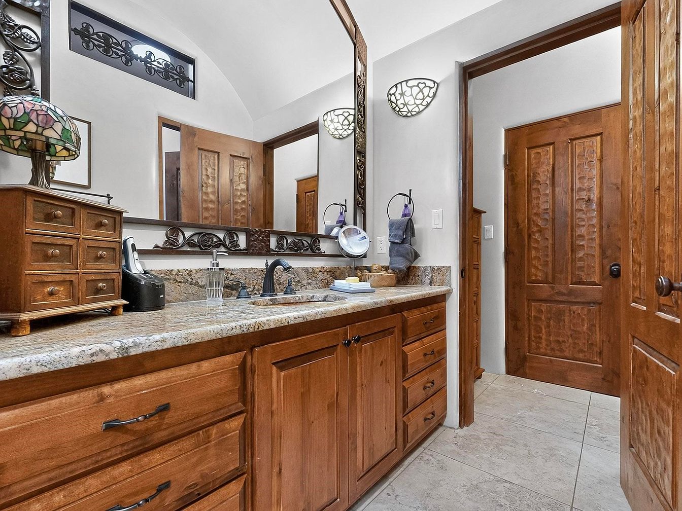 Rustic elegance sets the tone in this bathroom vanity area, featuring rich wood cabinetry topped with polished granite countertops. The ample counter space and dual sinks make this room functional for busy families, with plenty of storage provided by drawers and a charming small chest for organizing toiletries. Wrought iron accents in the decorative mirror and high horizontal window complement the classic craftsman doors, while soft gray walls enhance the warm wood tones. Artistic wall sconces provide a gentle glow, creating a welcoming and practical environment suited for all ages. The stone-tiled floor completes the sophisticated, family-friendly design.