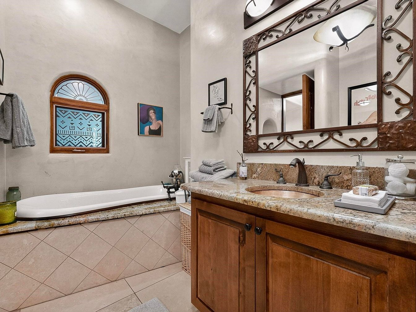Warm wood cabinetry anchors the space, complemented by a granite countertop and a detailed copper sink. An ornate framed mirror adds personality above the vanity, pairing beautifully with rustic bronze fixtures. Soft, neutral tiles and textured walls set a soothing tone, making the room inviting for families. A built-in bathtub beneath a stunning arched window offers a touch of luxury, with frosted geometric designs providing both privacy and style. Soft towels are thoughtfully arranged, and subtle decorative elements, such as glass jars and contemporary artwork, create an elegant yet comfortable ambiance for daily routines or relaxing soaks.
