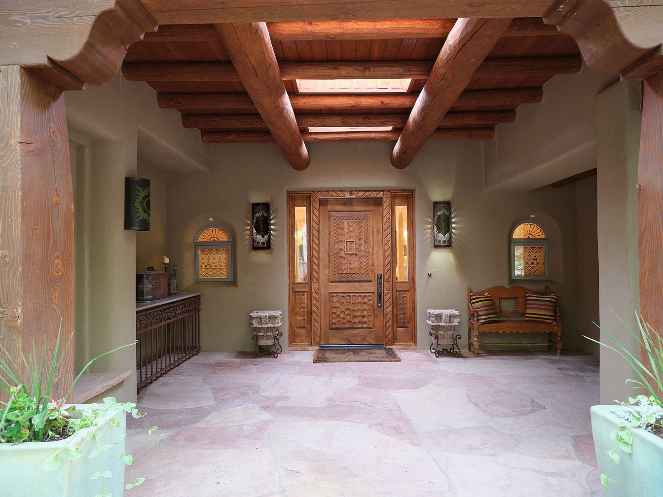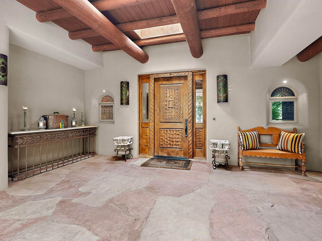Welcoming guests with warmth and style, the entryway features rustic wooden ceiling beams paired with a sophisticated wooden front door adorned with intricate carvings. Natural stone flooring creates a seamless connection with the earthy elements, while the soft beige walls brighten the space and enhance its cozy atmosphere. A decorative iron and marble console table provides a surface for candles and accents, perfect for setting the mood. The inviting wooden bench with striped pillows adds a touch of comfort and practicality, making it ideal for family use. Small arched windows and artistic wall sconces complete the elegant, Southwestern-inspired look.