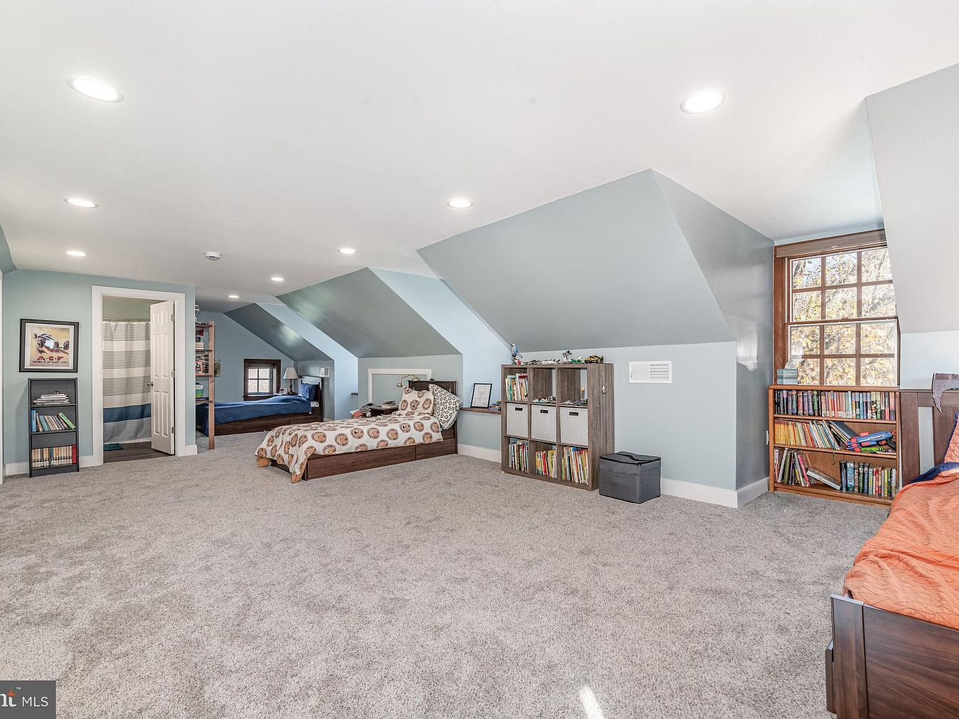 This inviting attic space features sloped ceilings that add character and a sense of coziness. The soft blue walls paired with plush, neutral carpet create a calming atmosphere. Designed for family fun, the room showcases two separate sleeping areas, one with a playful patterned bedspread, promoting relaxation and creativity. Natural light floods through large windows, enhancing the warmth of the environment. Functional built-in bookcases encourage a love for reading, filled with an array of colorful books. The open layout offers versatility for play or study, making it an ideal family-friendly haven in the home.