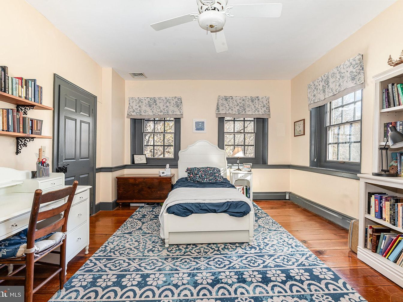 This charming kid’s bedroom features a cozy layout marked by a blend of playful and elegant design elements. Soft peach walls complement rich dark gray trim, creating a warm ambiance. A white bed adorned with vibrant bedding serves as the focal point, accompanied by a spacious, patterned area rug that adds a touch of whimsy. A neat desk and comfortable chair provide a perfect study nook, while built-in shelves house a collection of books, encouraging a love for reading. Natural light flows in through large windows, enhanced by floral valances, creating an inviting space that is both functional and delightful.