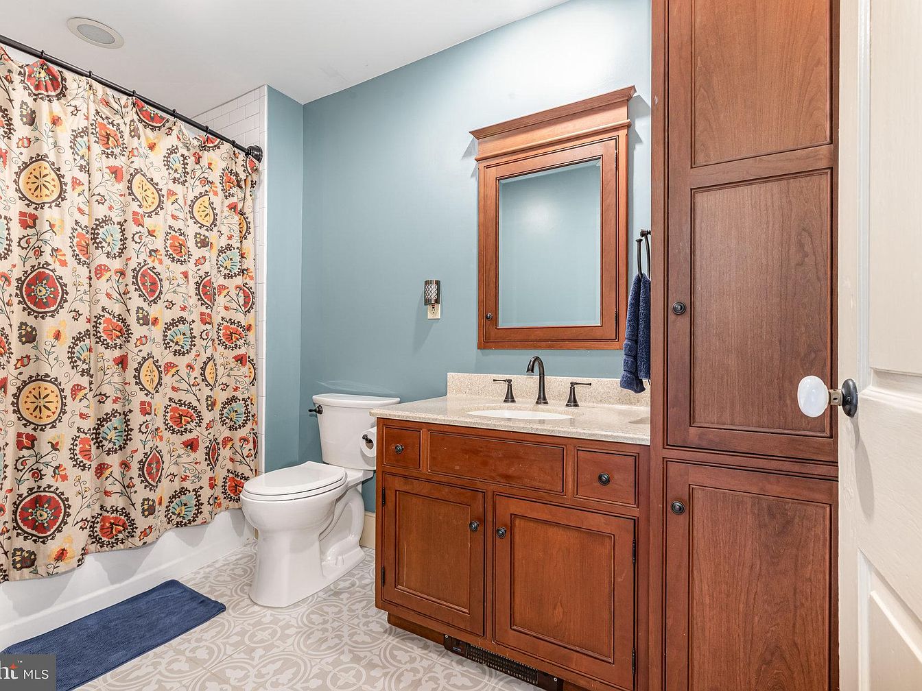 A serene bathroom space featuring a clever blend of comfort and elegance. Warm wooden cabinetry provides ample storage, harmonizing with the soft, muted blue walls. The intricate, patterned flooring adds a touch of vintage charm, enhancing the room’s character. A vibrant shower curtain with floral prints introduces playful colors, creating a family-friendly environment. The countertop offers a convenient space for daily essentials, paired with sleek black fixtures that complement the rustic feel. Thoughtfully placed lighting creates a welcoming ambiance, making this bathroom not just functional, but a delightful retreat for daily routines.