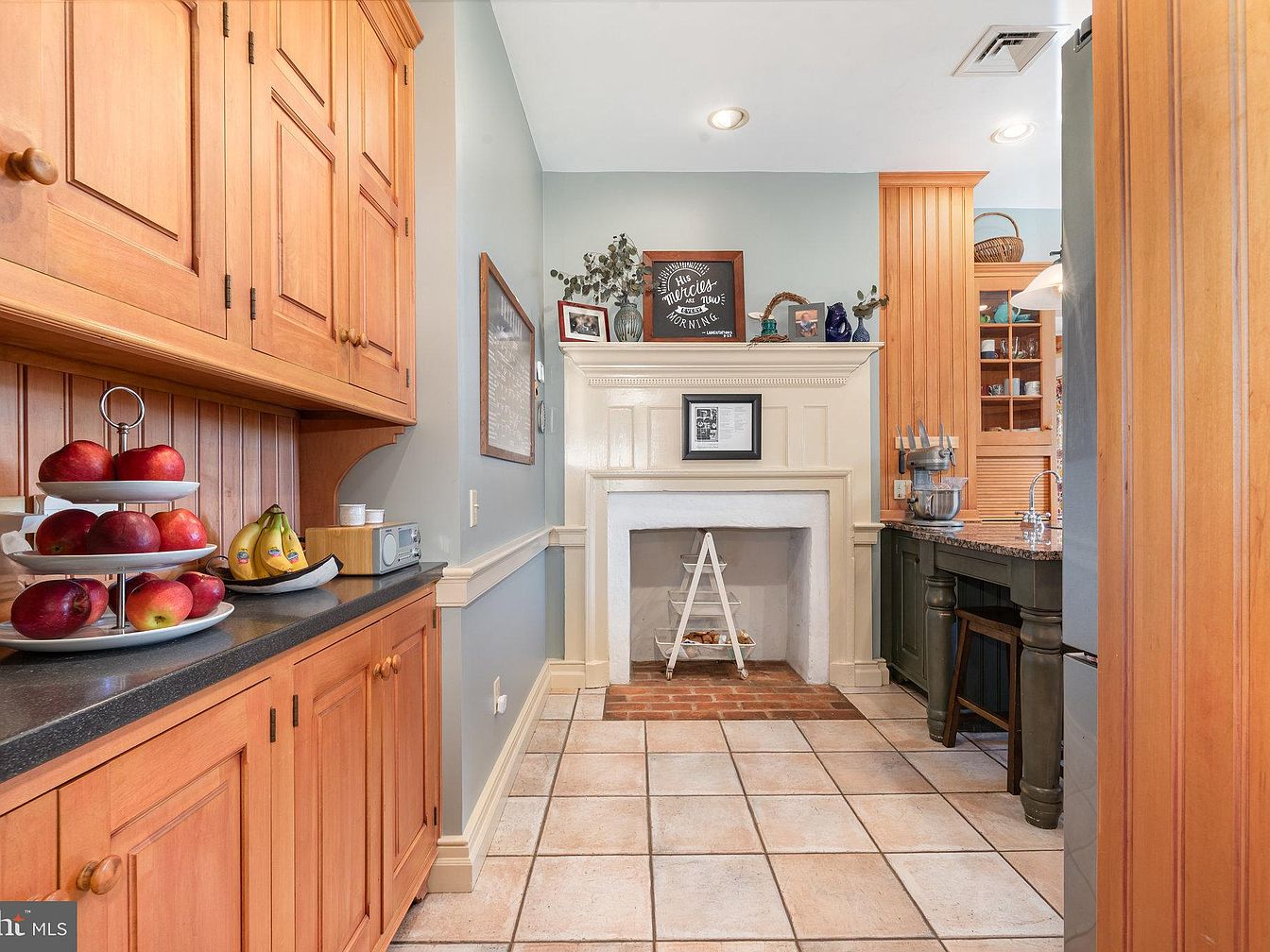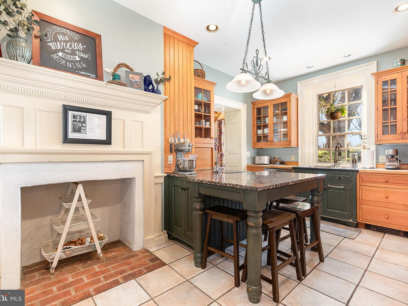 This charming kitchen blends modern functionality with classic design elements. A spacious island serves as a central gathering point, featuring a rich granite countertop and sturdy, dark-stained stools, perfect for family breakfasts or casual conversations. Light blue walls complement the warm wooden cabinetry, which includes glass-fronted upper cabinets ideal for displaying dishware. The traditional brick floor adds character and warmth, while the large window brings in natural light, showcasing lush outdoor views. Decorative touches like the framed artwork above the fireplace and potted plants enhance the welcoming atmosphere, making this space truly the heart of the home.