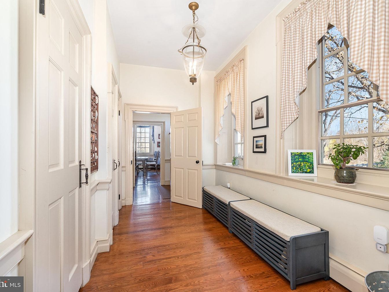 This charming entryway exudes warmth and elegance, featuring rich wooden floors that enhance the inviting atmosphere. The thoughtfully designed layout incorporates a comfortable seating area, flanked by stylish storage benches that ensure organization in a busy household. Soft, natural light filters through the large windows, complemented by gentle gingham curtains that add a touch of homely charm. Walls adorned with tasteful artwork create visual interest and personal flair. Architectural details such as the classic door frames and decorative lighting fixtures anchor the space, making it a perfect first impression that blends functionality with aesthetic appeal.