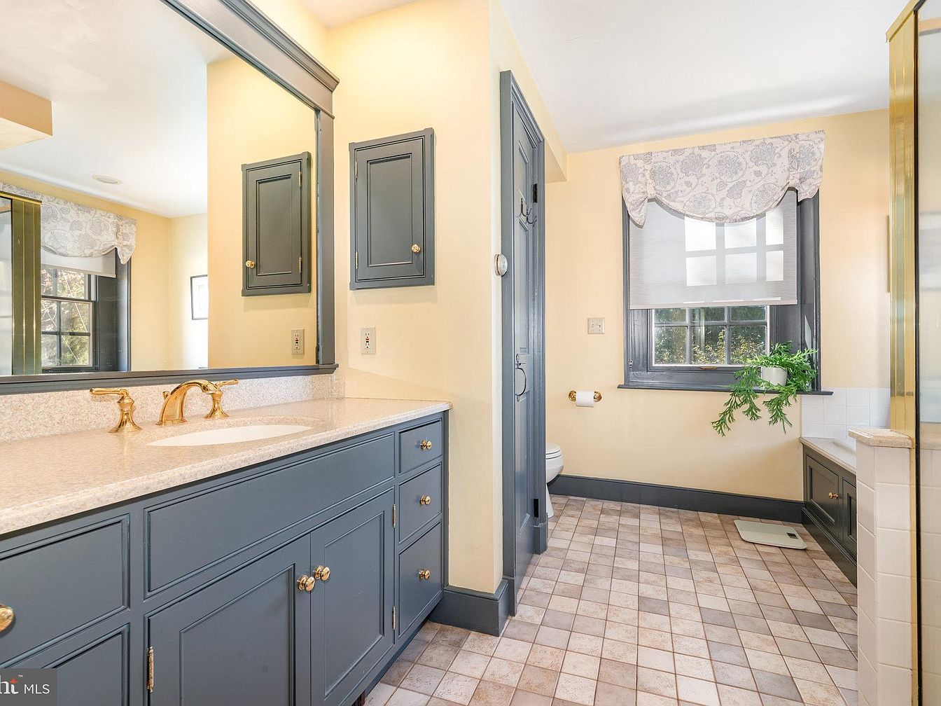This elegant bathroom features a spacious layout with a charming combination of blue cabinetry and soft yellow walls, creating a warm and inviting atmosphere. The double sink vanity, complete with striking gold fixtures, merges functionality with classic style. A large mirror amplifies the sense of space while reflecting natural light from strategically placed windows adorned with delicate fabric treatments. The textured tile flooring, featuring subtle earth tones, offers practicality and comfort underfoot. A potted plant adds a touch of greenery, enhancing the family-friendly ambiance and encouraging relaxation within this thoughtfully designed sanctuary.