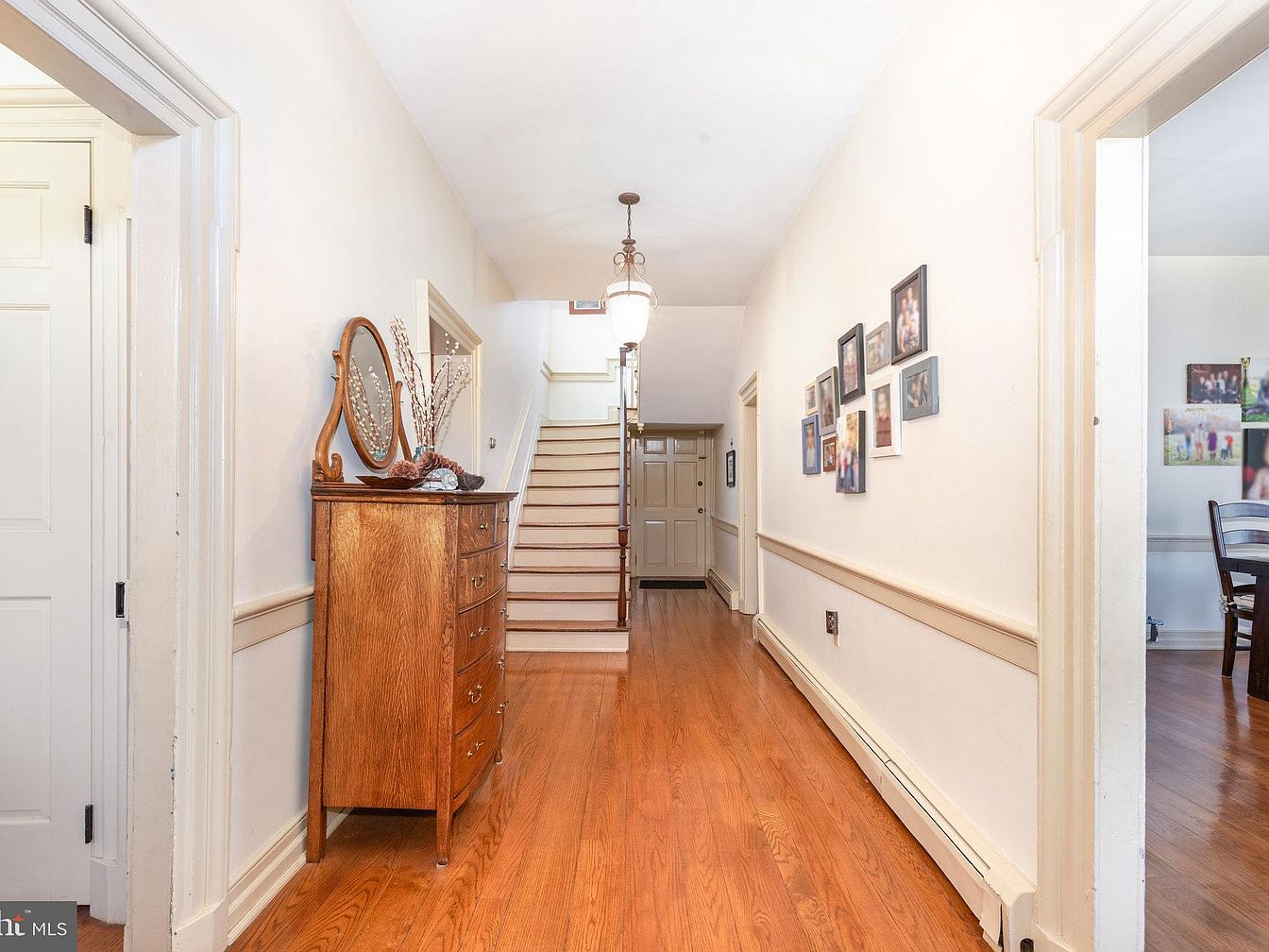 Enter this charming home through a beautifully designed entry hall, featuring warm hardwood flooring that flows seamlessly into the adjacent spaces. The walls, painted in soft neutral tones, create an inviting atmosphere complemented by wainscoting that adds a touch of traditional elegance. A stylish wooden dresser with a vintage mirror provides both functionality and aesthetic appeal, while decorative branches enhance the serene ambiance. Family photos artfully arranged on the wall celebrate cherished memories, adding a personal touch. A graceful light fixture casts soft illumination, guiding visitors up the staircase and into the heart of the home.