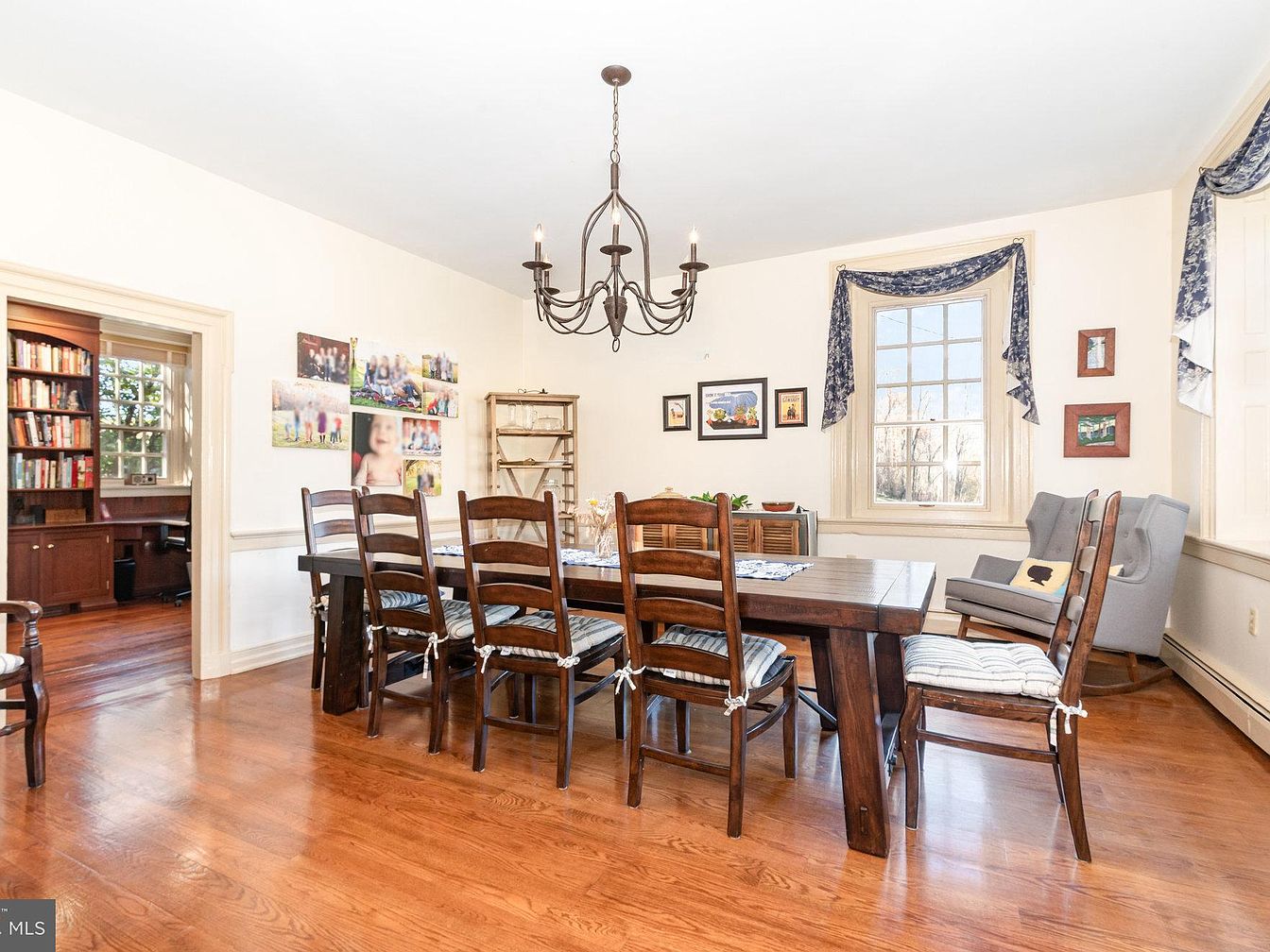 This inviting dining room features a spacious wooden table flanked by sturdy, rustic chairs, perfect for family gatherings. Warm hardwood floors enhance the room’s welcoming atmosphere, while softly painted walls in neutral tones create a serene backdrop. A classic chandelier provides elegant lighting, suspended above the table, adding charm to the space. Natural light floods in through large windows adorned with tasteful curtains, showcasing family photos and artwork that personalize the environment. Adjacent to the dining area, a cozy nook with a comfortable chair invites relaxation, making it an ideal spot to enjoy a book or sip coffee.
