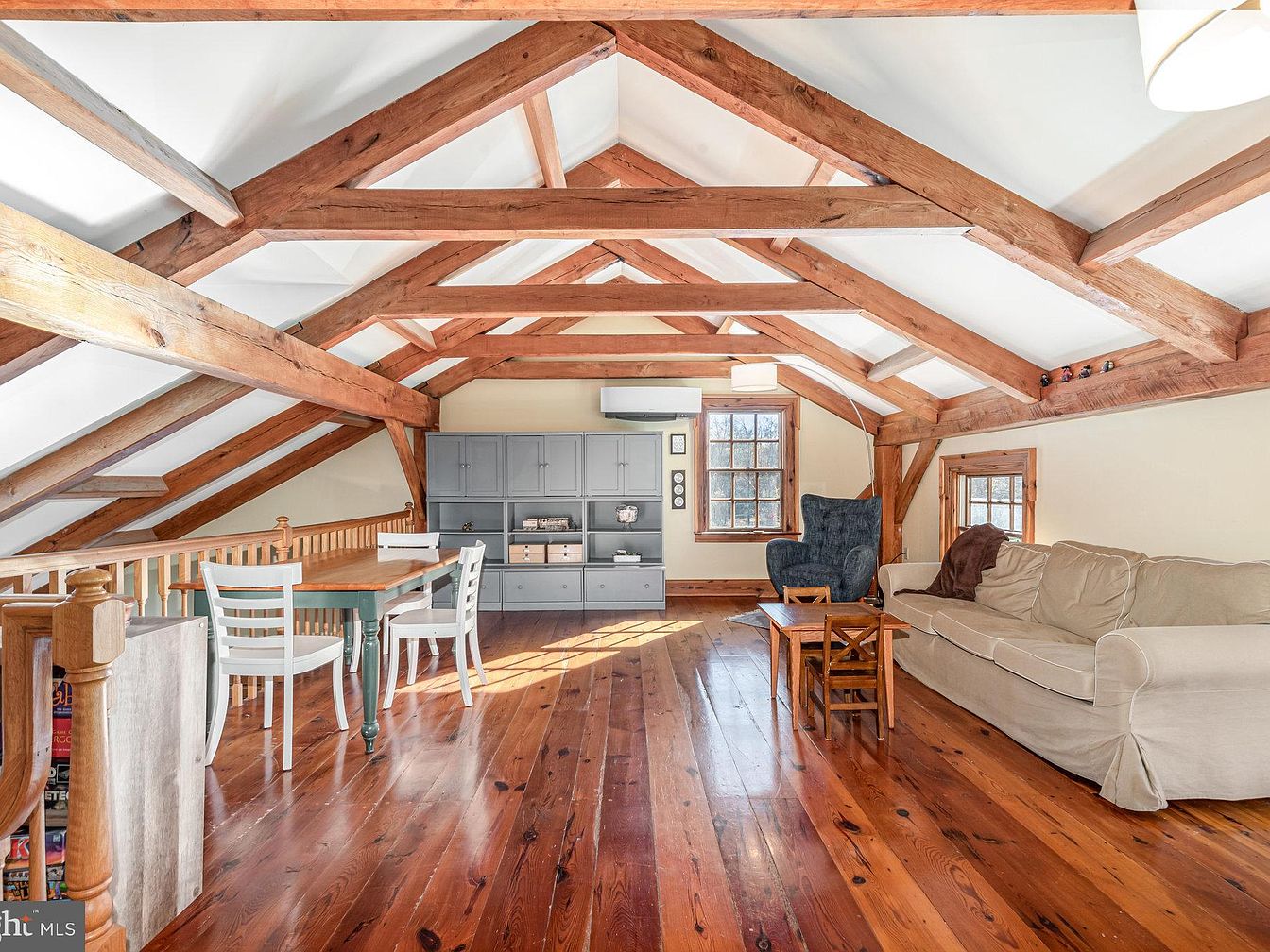 This inviting loft space features stunning exposed wooden beams that create an ambiance of warmth and character. The rich, polished hardwood floors enhance the cozy aesthetic, while ample natural light floods in through charming windows, making this area feel open and airy. A comfortable sectional sofa invites relaxation, complemented by a stylish armchair for quiet reading. The dining area boasts a rustic wooden table paired with elegant white chairs, perfect for family gatherings. Thoughtful storage solutions blend seamlessly with the décor, providing functionality without compromising on style, making it an ideal retreat for both leisure and family bonding.