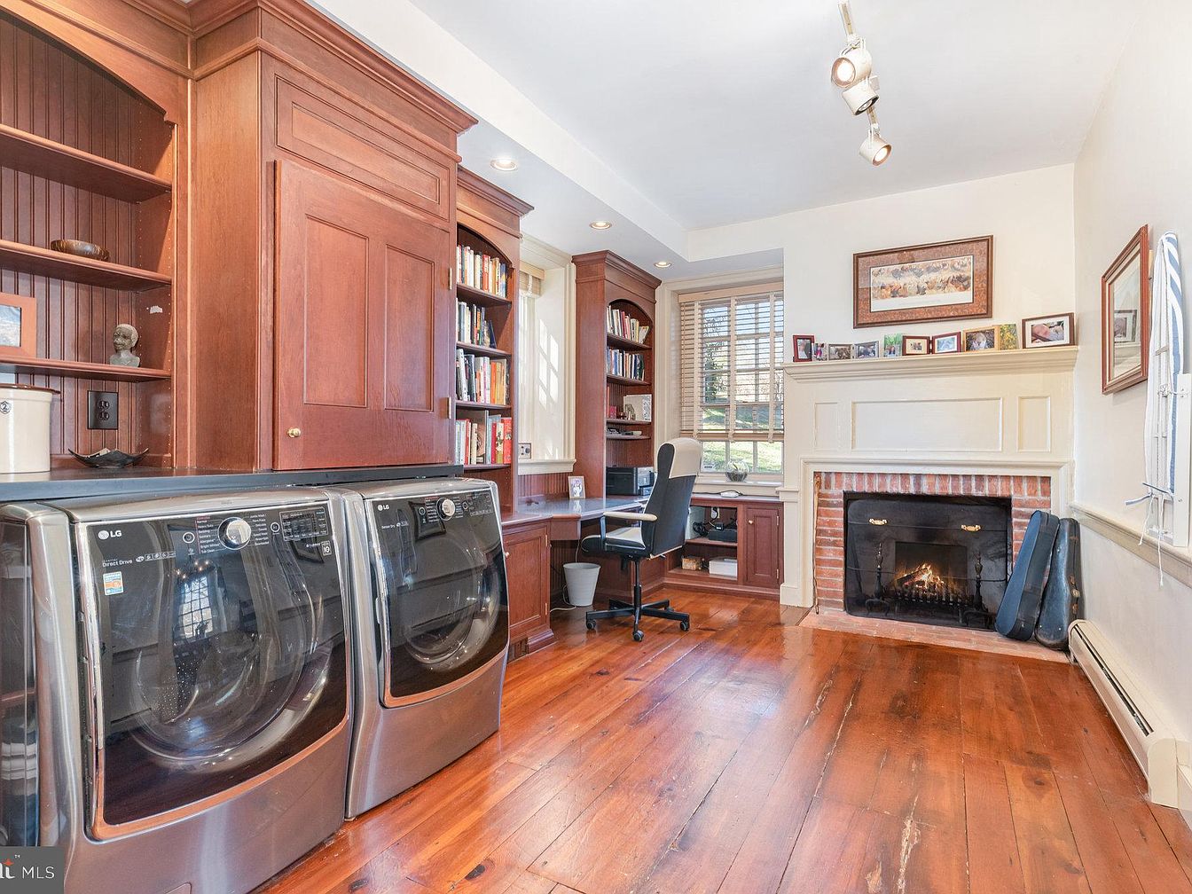 This inviting laundry room blends functionality with cozy charm. The rich, wooden cabinetry and shelving create a warm atmosphere while providing ample storage for books and essentials. Sleek, modern appliances sit side by side, ensuring efficiency in daily chores. The room features smart organizational elements, making it family-friendly and convenient. A brick fireplace adds a touch of rustic elegance, perfect for chilly days, while large windows flood the space with natural light. The harmonious color palette combines earthy tones, enhancing the room’s welcoming feel, making this laundry area not just a utility space, but a comfortable retreat.