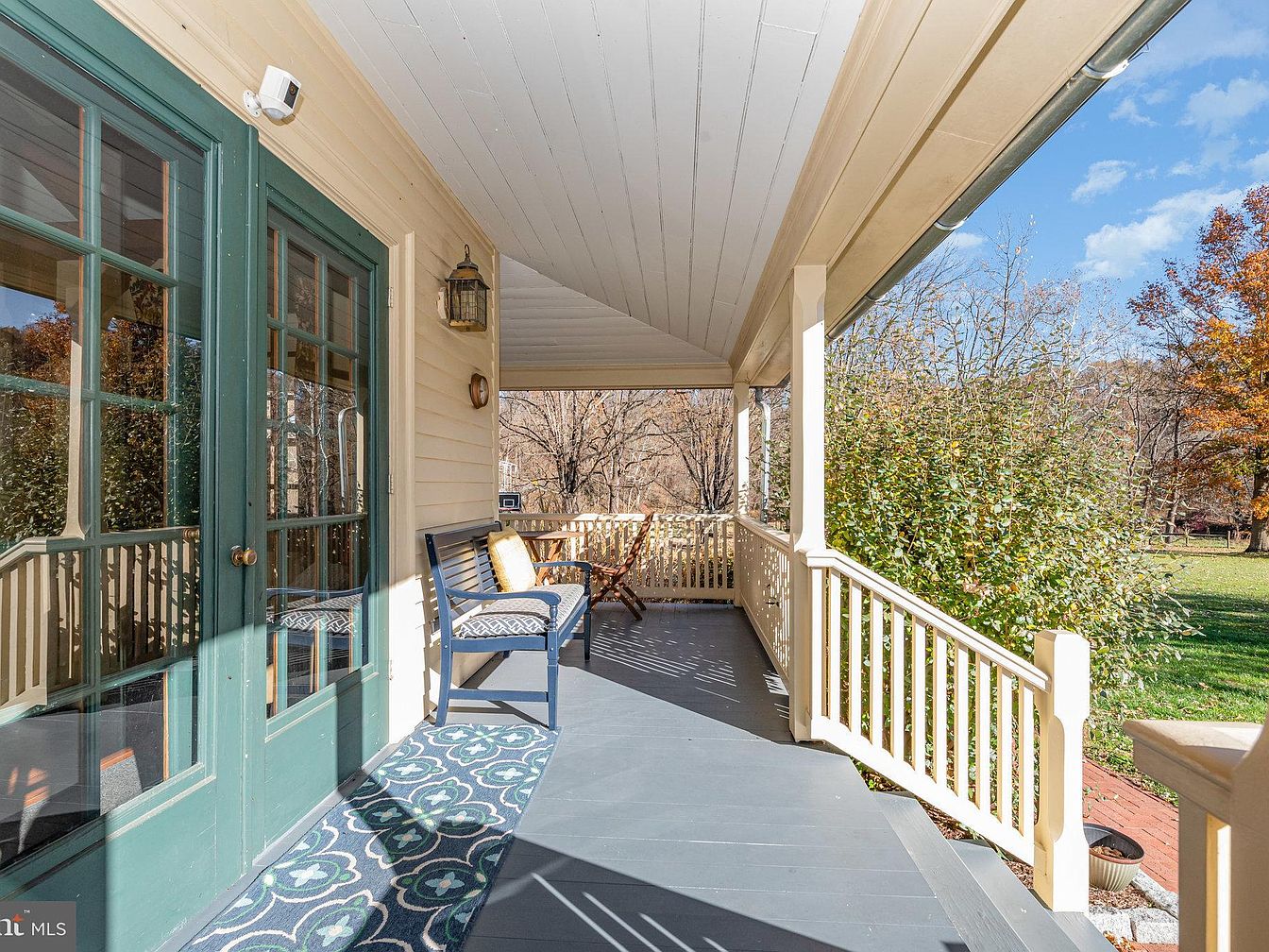 This inviting front porch showcases a blend of traditional and contemporary design, ideal for relaxation and family gatherings. The spacious layout is enhanced by a vaulted ceiling and well-placed lighting, creating a warm ambiance. Rich teal doors add a pop of color, complementing the neutral beige siding. A patterned outdoor rug and comfortably upholstered seating invite guests to unwind. Family-friendly features include a sturdy railing and ample space for children to play. Lush greenery surrounds the porch, offering a peaceful view and a sense of tranquility. Enjoy leisurely evenings or morning coffee in this charming outdoor space.