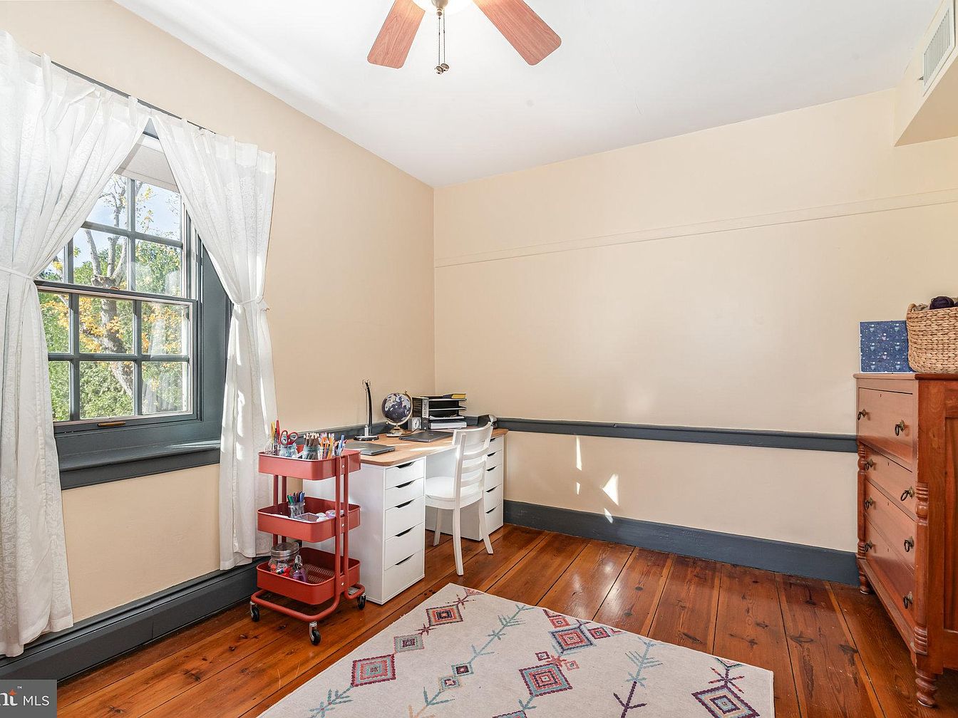 This serene home office features a soothing blend of modern and vintage aesthetics. Natural light floods through the large window, accentuated by sheer white curtains, creating a warm and inviting atmosphere. The light beige walls contrast beautifully with the rich, dark wood accents, including the baseboards and window frame. A sleek white desk is paired with a minimalist chair, promoting a clutter-free workspace, while a rolling cart adds practicality, holding essential supplies. The polished wood flooring adds charm, complemented by a patterned rug that introduces subtle color. The ceiling fan enhances airflow, ensuring comfort in this cozy, productive space.