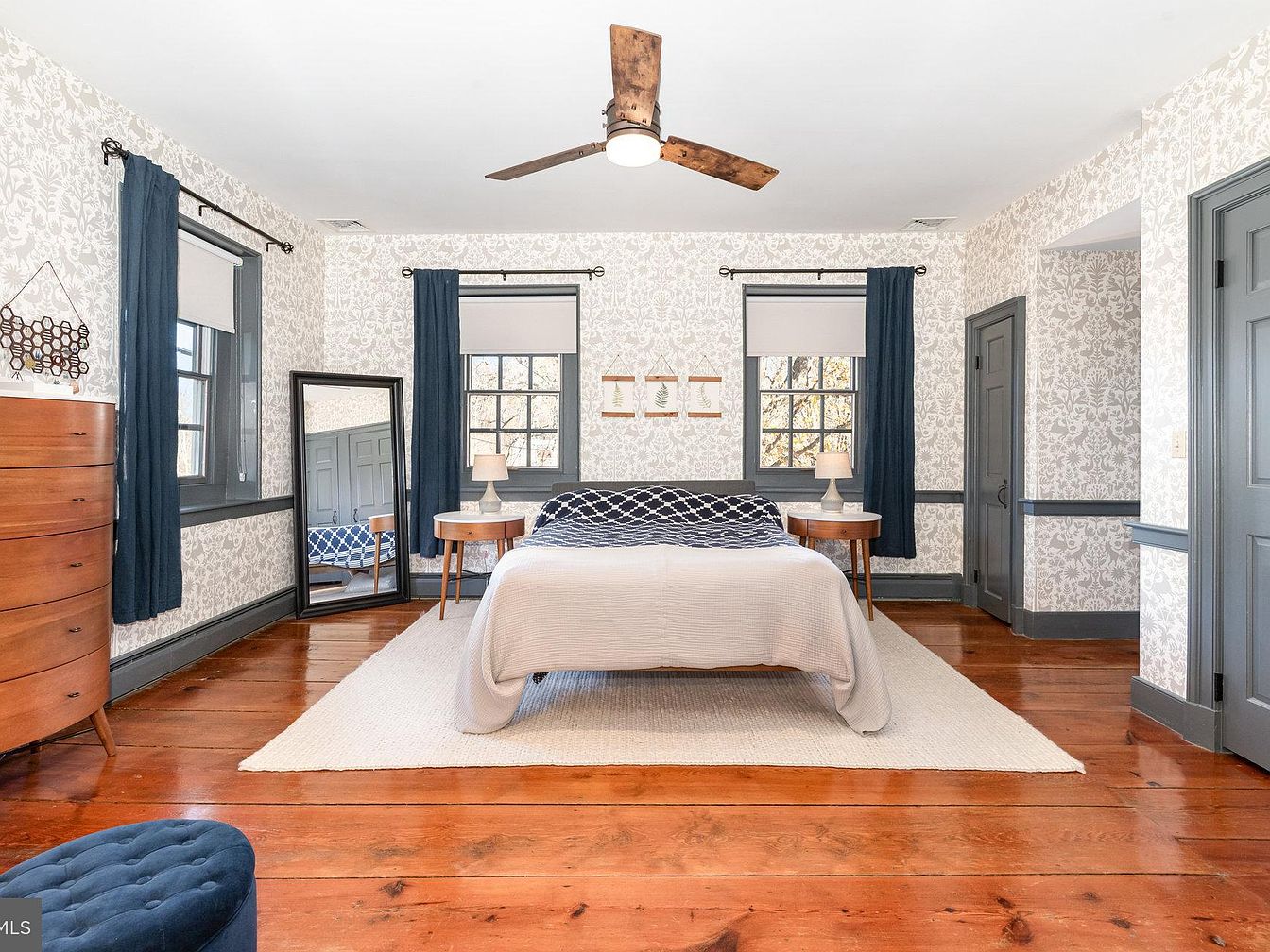 This master bedroom showcases a harmonious blend of vintage charm and modern comfort. The elegant wallpaper featuring intricate floral patterns complements the soft, neutral tones of the bedding, which invites relaxation. Rich hardwood floors add warmth, contrasting beautifully with the light area rug. Large windows allow natural light to flood the space, framed by deep navy curtains that add a touch of sophistication. Functional elements include a circular mirror and stylish nightstands, enhancing the room’s usability. The wooden dresser offers practical storage, while the ceiling fan provides an airy feel, perfect for a family-friendly retreat.