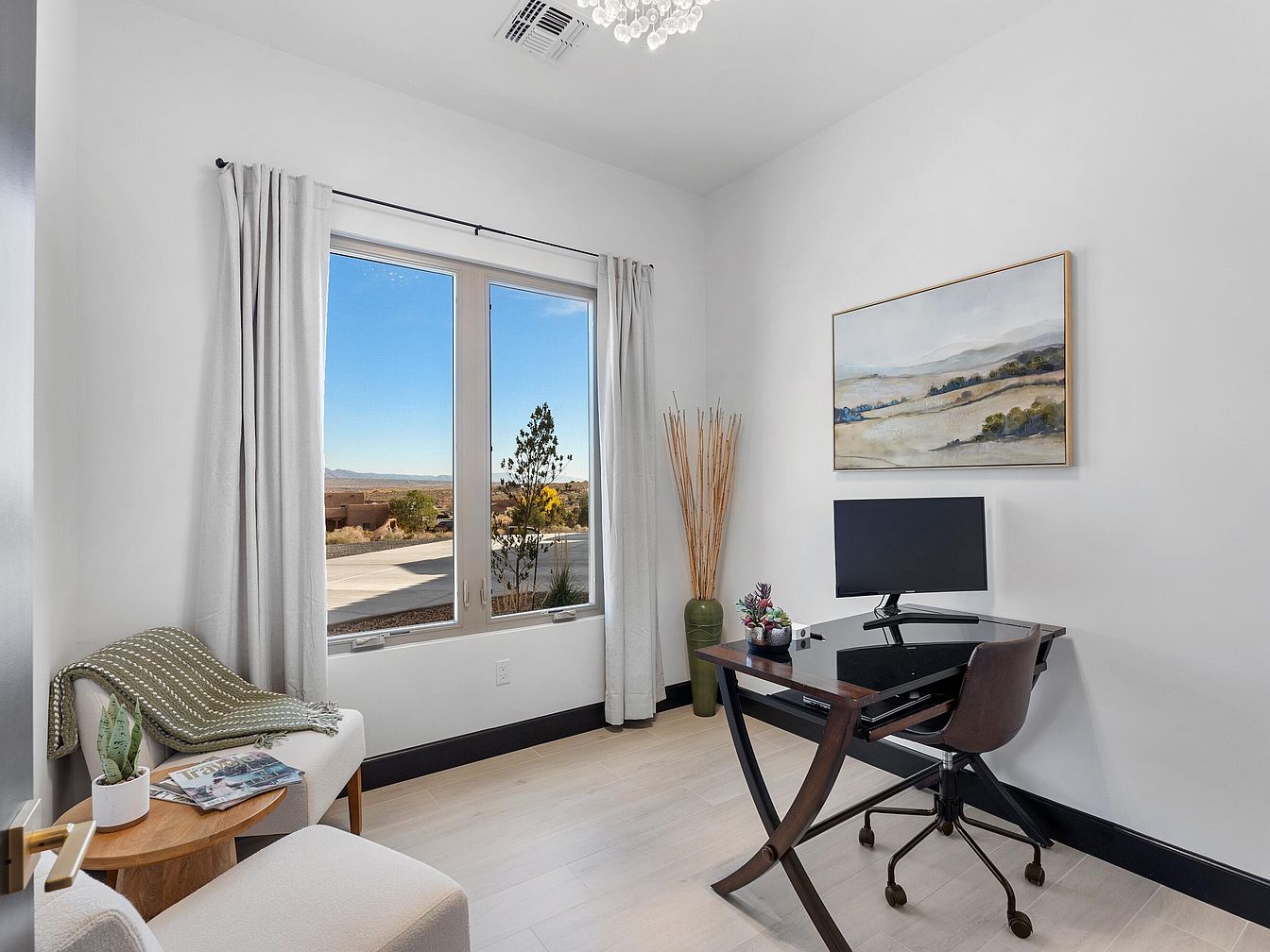 This serene home office combines functionality with style. Brightened by large windows, natural light floods the room, showcasing breathtaking views of the outdoors. Soft gray walls harmonize with the minimalist decor, while a modern wooden desk pairs perfectly with a sleek ergonomic chair. A cozy armchair, wrapped in a textured throw, provides a perfect reading nook, inviting relaxation during breaks. The color palette, featuring soft neutrals complemented by a touch of greenery from plants, enhances the tranquility of the space. Decorative accents like a framed landscape painting and natural elements add character, making this office a welcoming retreat for productivity.