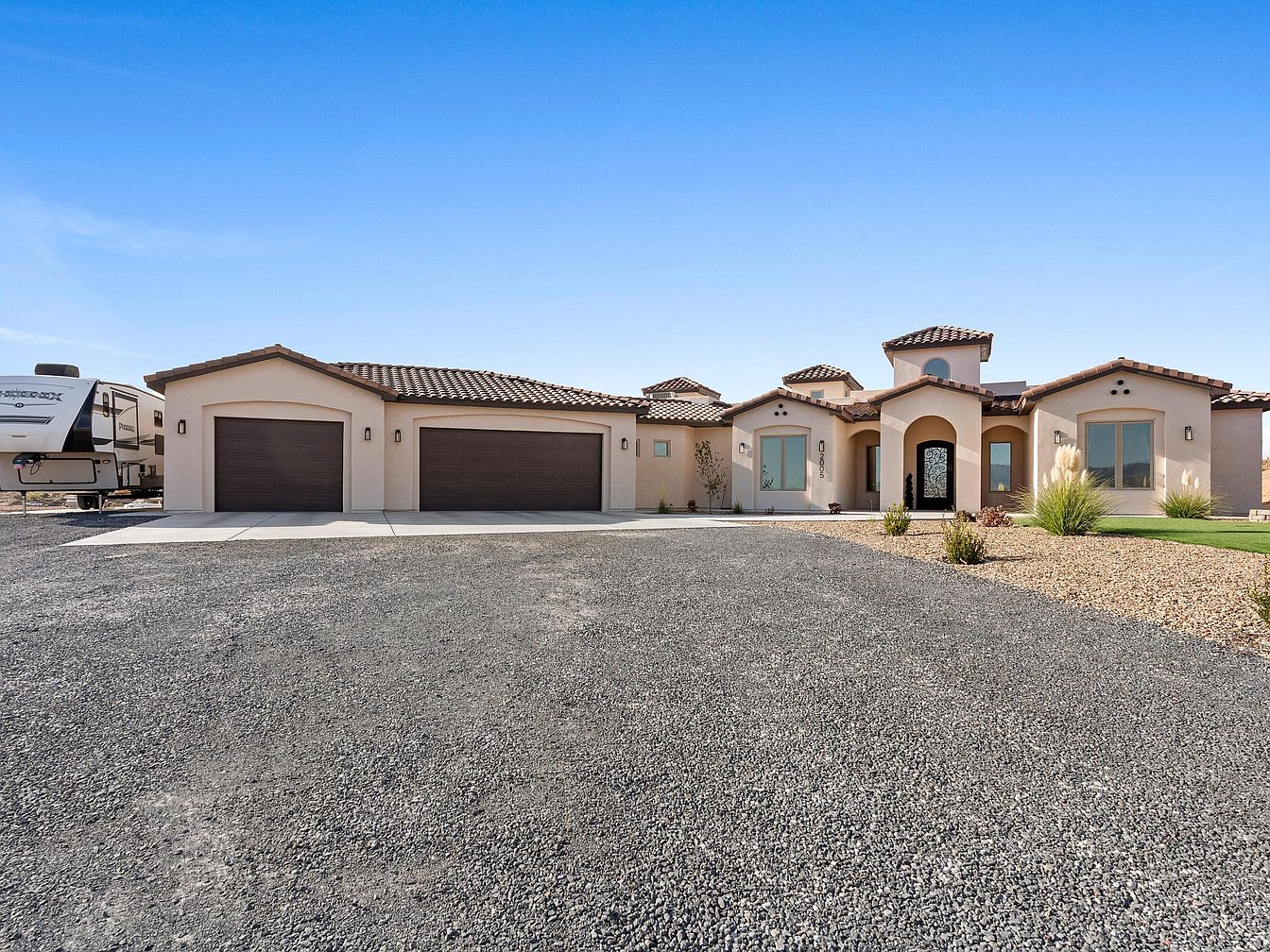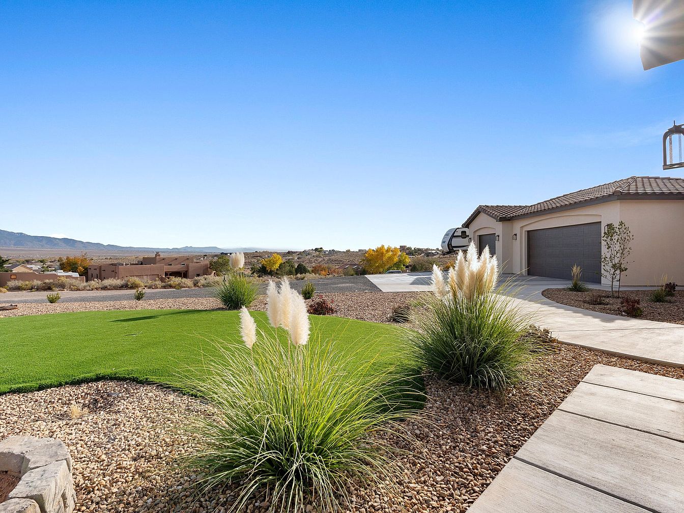 This inviting front yard features a blend of lush, artificial grass and decorative gravel, creating an elegant yet low-maintenance landscape. Towering ornamental grasses sway gently, adding texture and movement to the serene space. The contemporary home design showcases a combination of soft beige stucco and red-tiled roofing, providing a warm, welcoming aesthetic. A winding concrete driveway leads to the spacious garage, while carefully arranged native plants enhance the natural beauty of the surroundings. The panoramic views of the distant mountains not only offer spectacular scenery but also promote a sense of tranquility, ideal for family gatherings and outdoor relaxation.