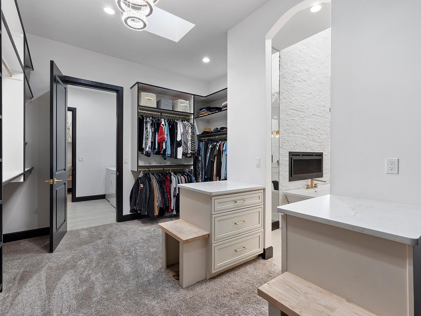 This walk-in closet features an open layout that optimizes space and functionality, combining style with practicality. Light gray walls complement the plush carpeting, creating a cozy atmosphere. Elegantly designed, the cabinetry in a soft beige showcases ample storage with pull-out drawers and stylish hardware. A well-organized hanging system displays clothing neatly, making it easy to select outfits. Thoughtful details, like the chandelier and natural light from the skylight, add sophistication. Comfortable seating provides a perfect spot for putting on shoes or organizing accessories, ensuring a family-friendly space that meets everyday needs while maintaining a luxurious feel.
