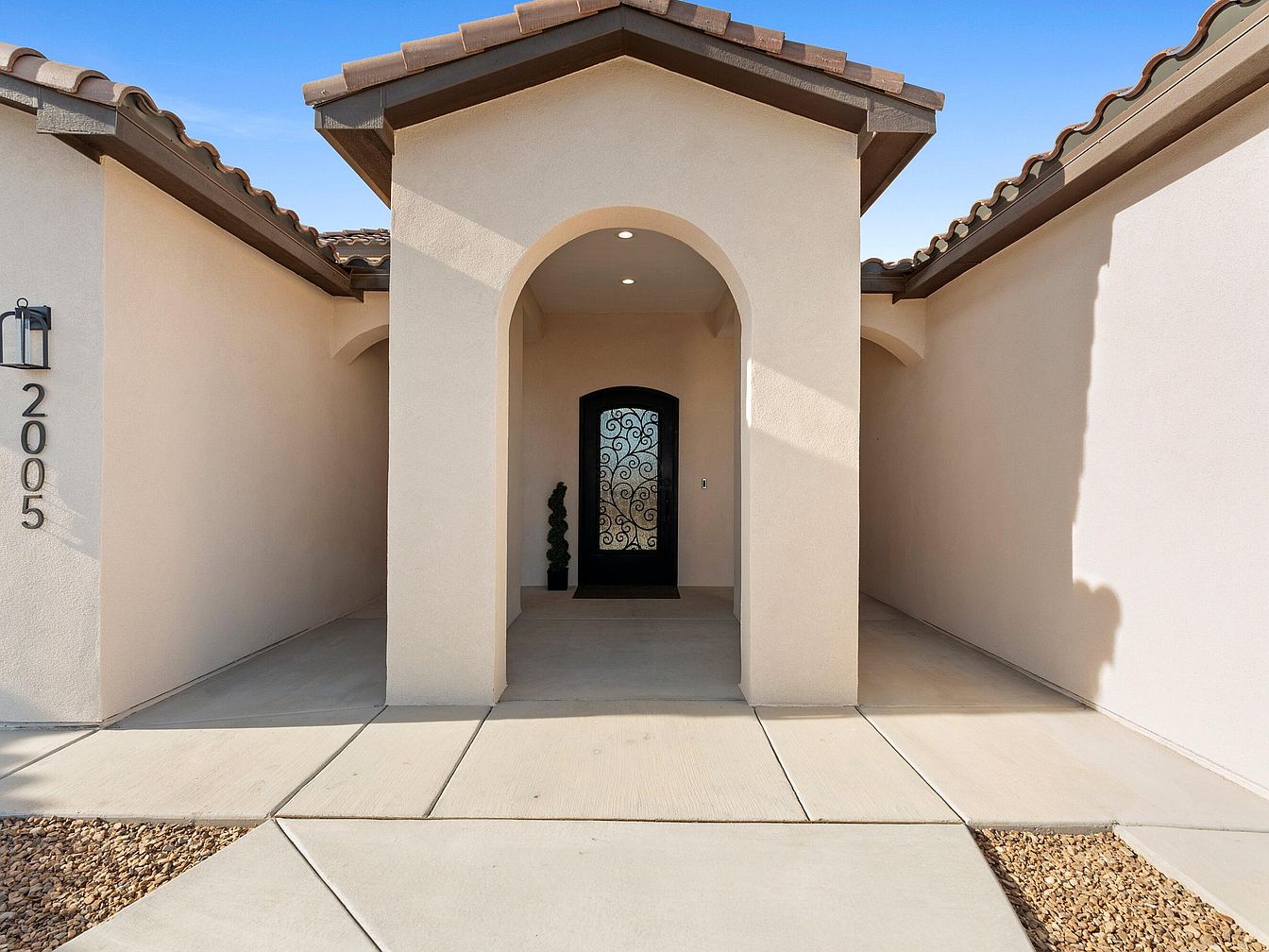 The entrance to this American home features a warm and inviting design, highlighted by a graceful arched entryway. Soft neutral tones on the stucco walls create a serene ambiance, complemented by earthy clay tile roofing. A striking wrought iron door adds character and security, embodying both elegance and charm. The wide, concrete walkway and carefully placed landscaping stones ensure a family-friendly atmosphere, perfect for both entertaining and everyday use. Ample natural light brightens the space, enhancing the overall welcoming feel. This thoughtfully designed entrance not only captivates the eye but also sets the tone for the home beyond.