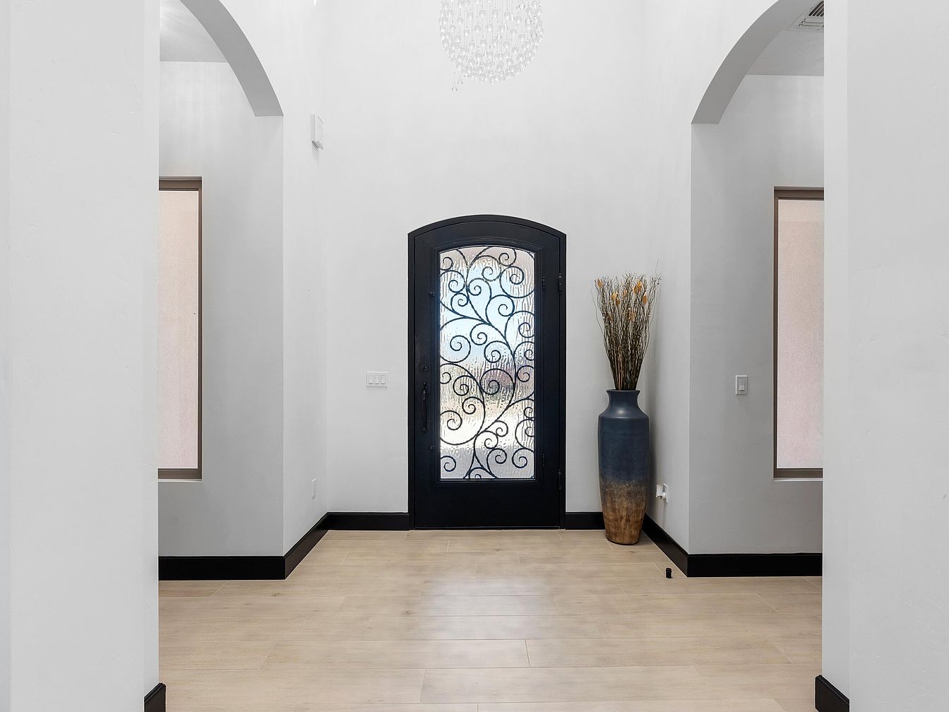 This stunning entryway invites guests into a refined space, showcasing a grand black iron door adorned with intricate scrollwork. The high ceilings are accentuated by a modern chandelier, creating a bright and welcoming ambiance. Soft, neutral walls contrast beautifully with the rich black trim and baseboards, while large windows allow natural light to fill the area. A spacious layout ensures a comfortable flow, perfect for family gatherings. An elegant vase with dried flora adds a touch of natural beauty, enhancing the sophisticated decor. The use of light wood flooring creates warmth, making this entryway both stylish and inviting.