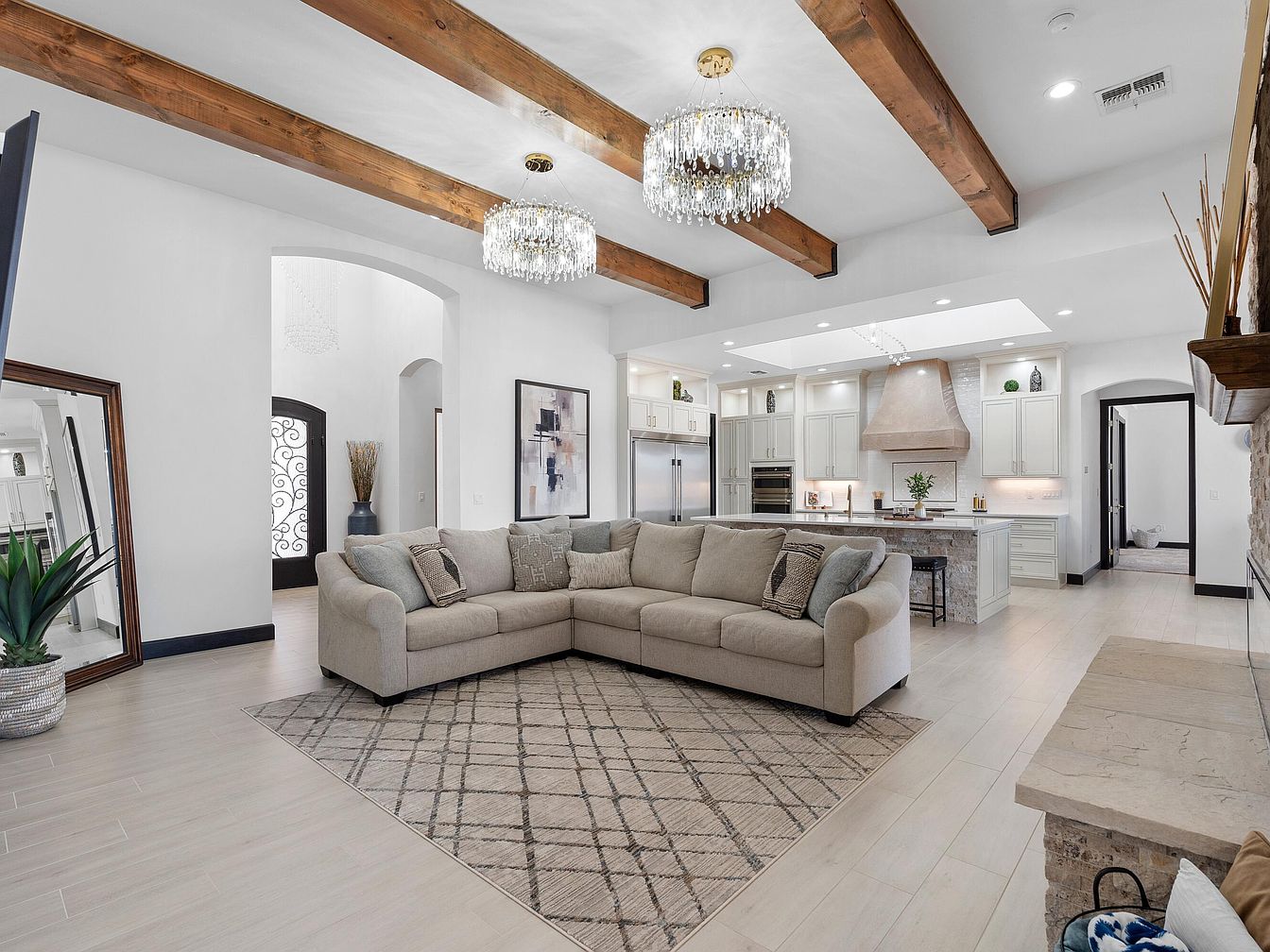 This inviting living room features an open layout with a cozy sectional sofa, perfect for family gatherings. Highlighted by stunning wood beams and elegant crystal chandeliers, the space exudes warmth and sophistication. Neutral shades of beige and soft grays provide a calming backdrop, while the textured area rug adds depth. A contemporary coffee table paired with decorative pillows enhances comfort and style. The adjacent kitchen showcases custom cabinetry and a designer range hood, seamlessly connecting a functional yet stylish heart of the home. This area is designed for both relaxation and entertaining, making it ideal for modern family living.