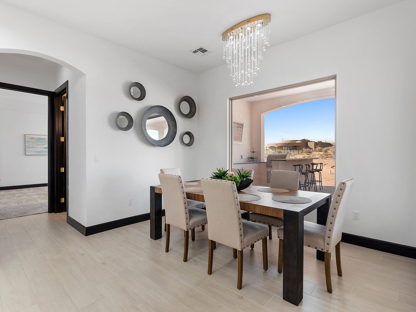This elegant dining room offers a seamless blend of modern aesthetics and family-friendly functionality. The spacious layout features a chic wooden dining table surrounded by plush upholstered chairs, each adorned with stylish studded detailing. A captivating chandelier hangs above, casting a warm glow over gatherings. The room’s light color palette, featuring soft whites and subtle earth tones, enhances the airy feel, while circular mirrors create a visually appealing focal point on the wall. Large openings provide a picturesque view of the outdoor landscape, allowing for a natural flow between indoor and outdoor living spaces, perfect for entertaining.