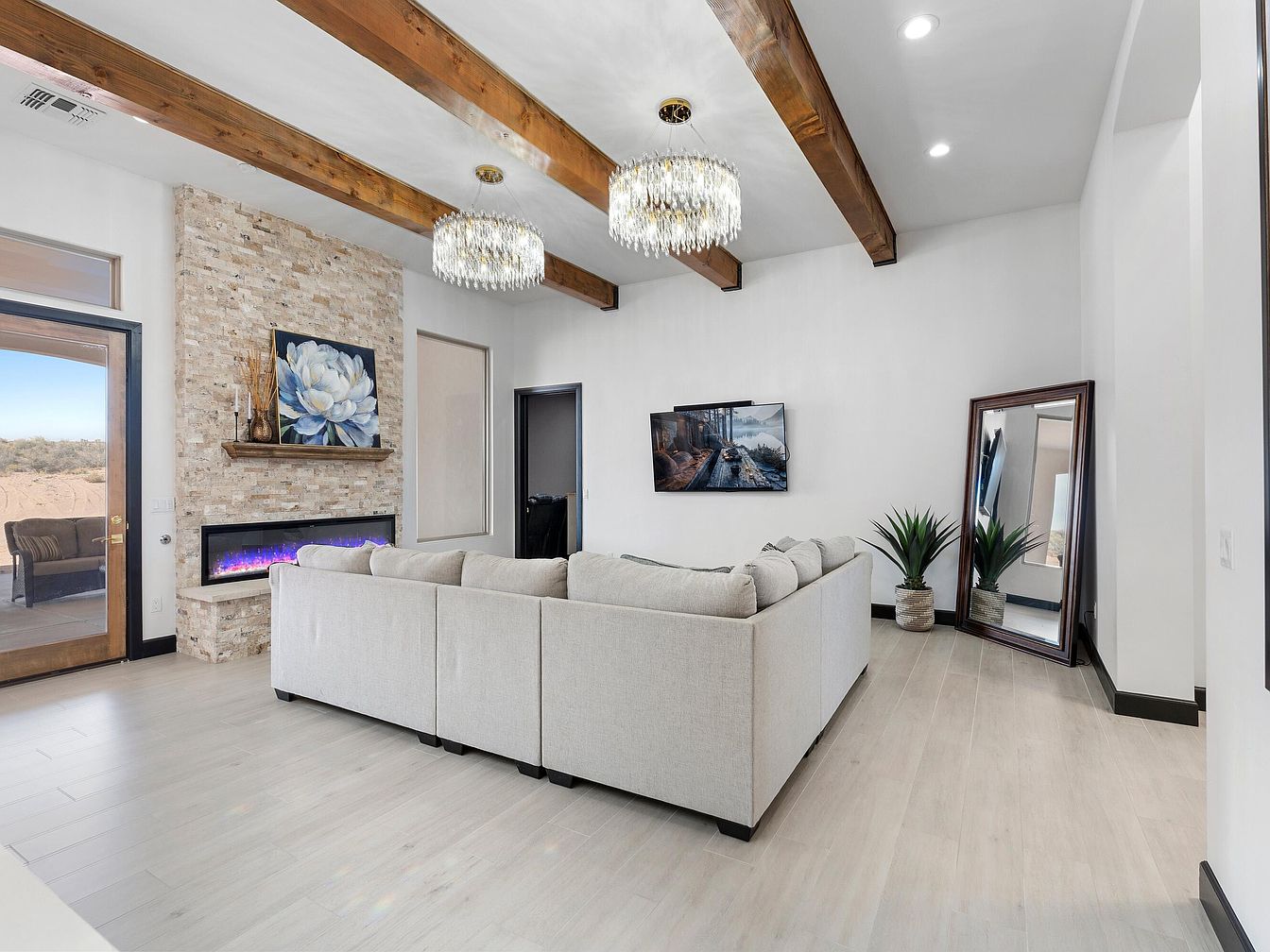This living room combines elegance and comfort, featuring high ceilings accentuated by rich wooden beams that add warmth to the space. A striking stone feature wall holds a sleek electric fireplace, offering a cozy atmosphere. The light, neutral color scheme enhances the bright and airy feel, complemented by plush, low-profile furnishings that encourage relaxation. Large windows provide natural light and a seamless connection to the outdoor landscape. A large mirror and decorative plants add layers of visual interest and vibrancy. It’s an inviting family-friendly space perfect for gatherings and creating lasting memories.