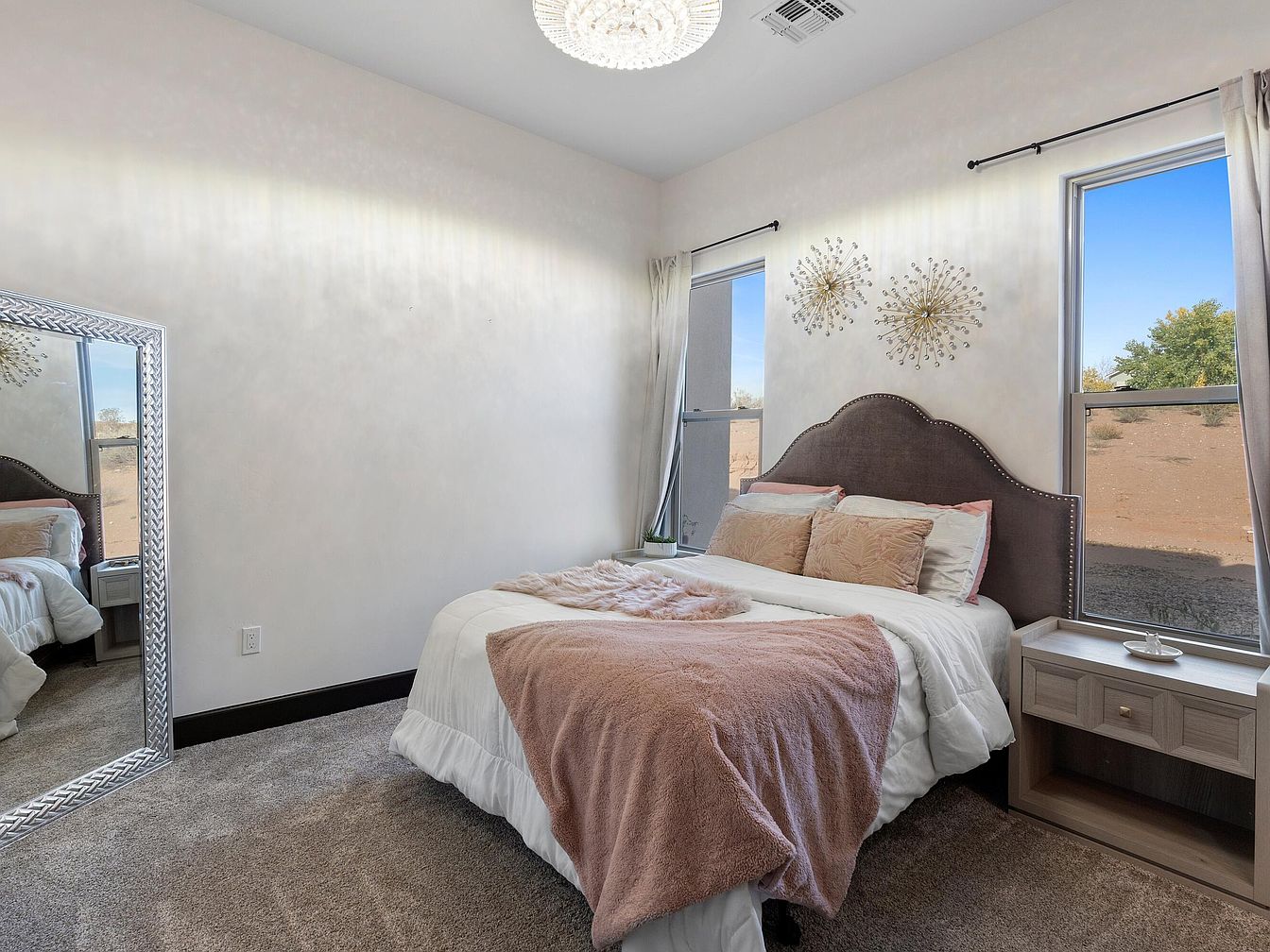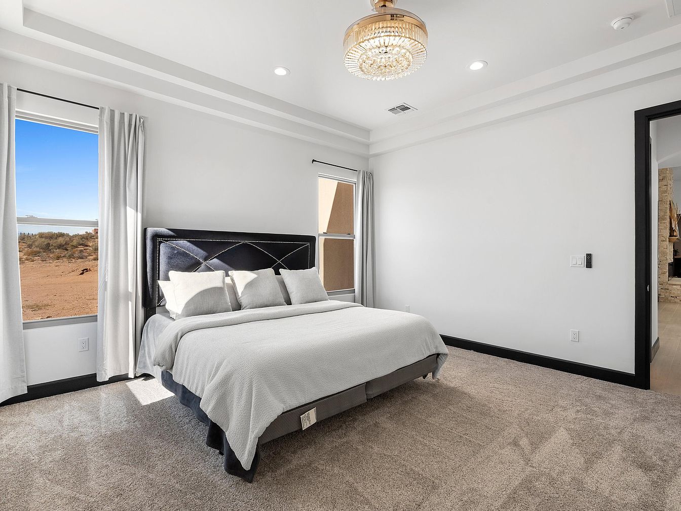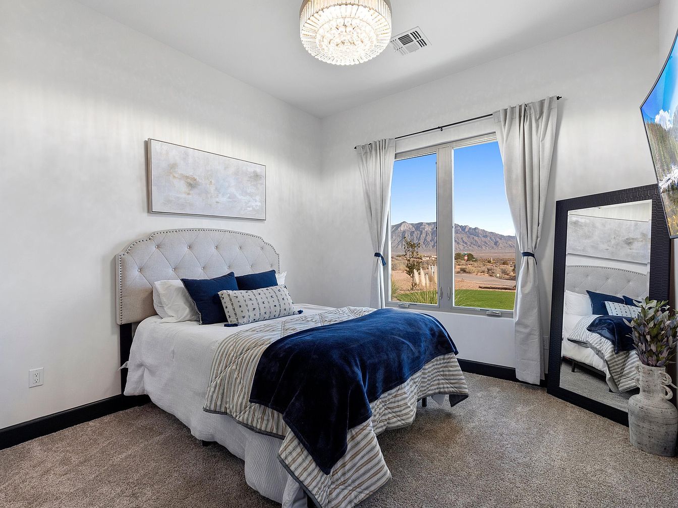 This master bedroom exudes a modern elegance with its spacious layout and thoughtful design elements. Soft, plush carpeting invites comfort, while large windows frame stunning views, allowing natural light to fills the room. The striking navy headboard contrasts beautifully against the crisp white walls, complemented by stylish accent pillows. A contemporary chandelier hangs from the ceiling, adding a touch of sophistication. Subtle architectural details, such as crown molding, enhance the overall aesthetic. The room’s color scheme of cool tones fosters a serene atmosphere, making it family-friendly and a perfect retreat for relaxation after a long day.