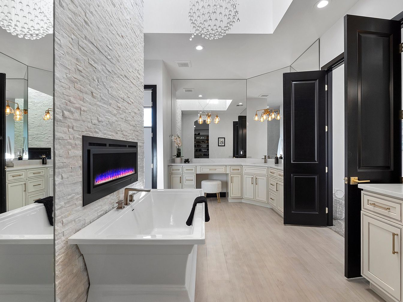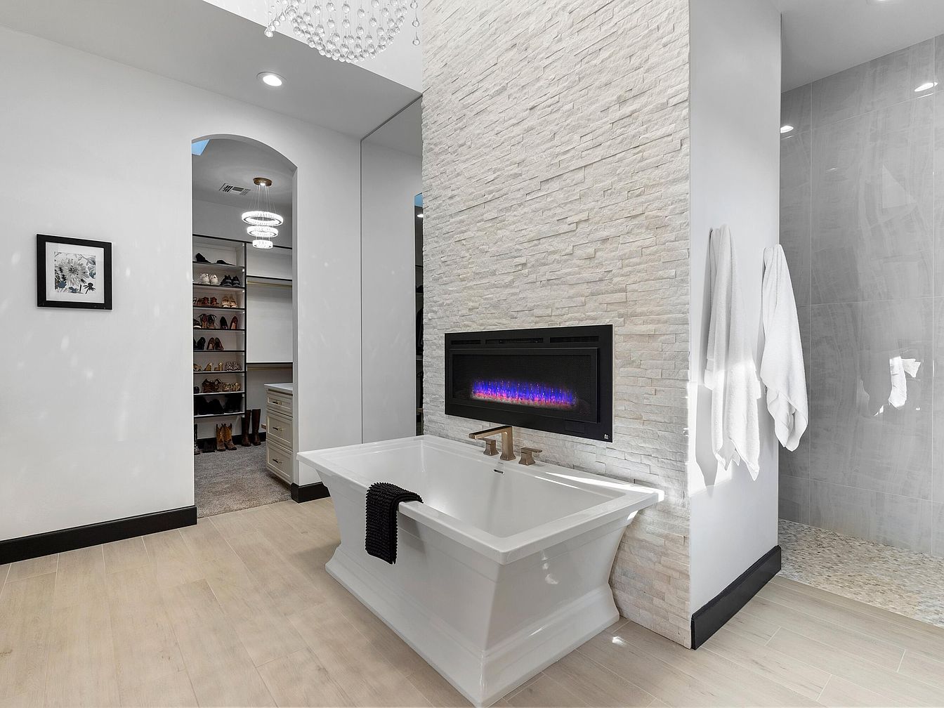 This luxurious master bathroom features a spacious layout, combining modern elegance with comfort. The centerpiece is a freestanding tub, elegantly situated under a stylish chandelier, inviting relaxation. A wall-mounted electric fireplace adds warmth and ambiance, with a mesmerizing color display. Complementing the chic design, the stone accent wall introduces texture against sleek, bright surfaces. Neutral tones dominate the color palette, with light wood flooring enhancing the serene atmosphere. Practical features include a generous walk-in closet, seamlessly integrated for easy access. Soft white towels and modern fixtures contribute to the overall inviting and sophisticated aesthetic of this tranquil retreat.