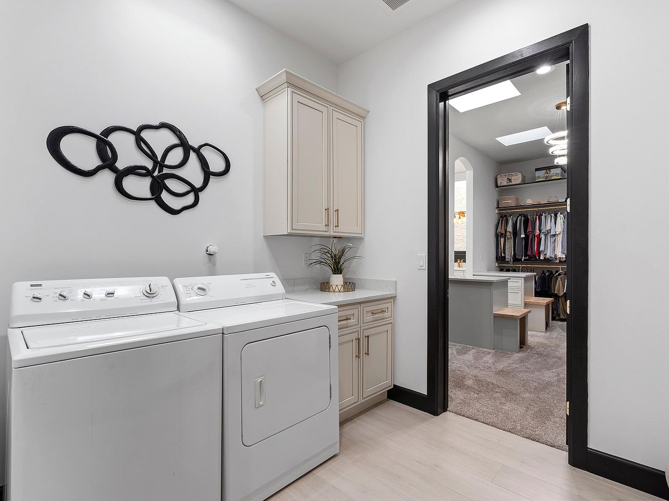 This stylish laundry room features a contemporary layout with smooth, light-colored cabinetry that offers ample storage, blending seamlessly into the bright, airy aesthetic. The pristine white washer and dryer create a clean look, while decorative wall art adds a touch of personality. A plush, neutral-toned carpet underfoot enhances comfort, making this space family-friendly. Natural light pours in from the door leading to a well-organized closet area, equipped with custom shelving for practicality. The sleek countertops provide space for folding clothes, ensuring functionality marries with elegance in this essential home space.