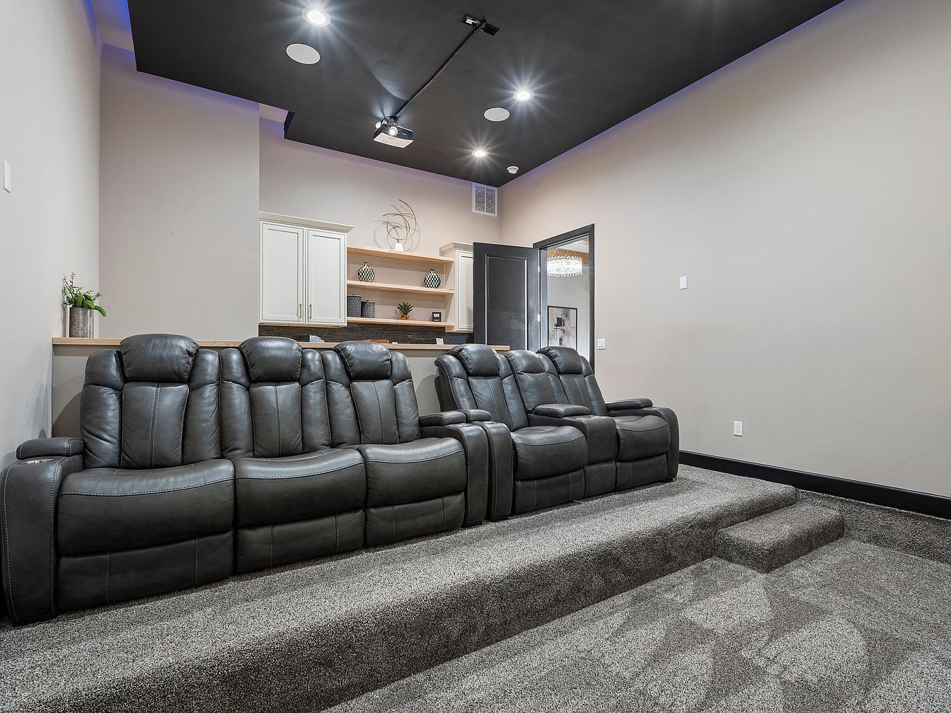 This inviting home theater features plush, reclining leather seating arranged in a tiered formation, perfect for family movie nights. The dark, cozy ambiance is enhanced by rich gray carpeting and a sleek black ceiling, offering a modern and sophisticated look. Soft blue LED lighting subtly highlights the architectural details, creating a cinematic feel. Behind the seating area, a stylish wet bar with light cabinetry adds convenience, making entertaining effortless. Thoughtful design elements, like soundproof walls and intricate crown molding, contribute to the overall charm, ensuring a perfect space for relaxation and enjoyable gatherings with loved ones.