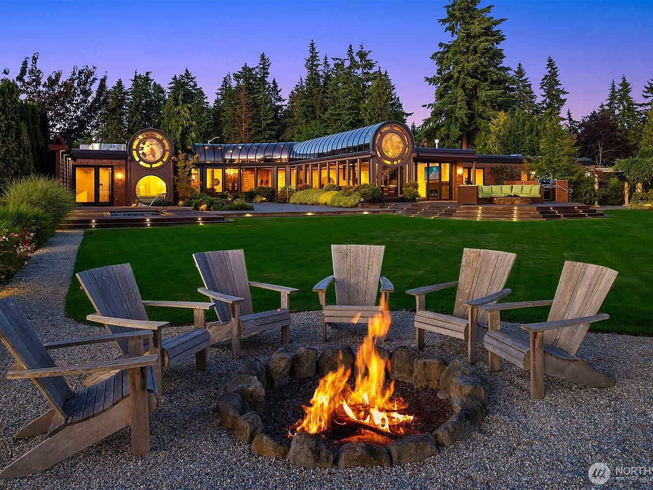 A welcoming outdoor retreat features a spacious, perfectly manicured lawn edged with lush greenery and flowering shrubs. At the center, a rustic stone fire pit is surrounded by classic wooden Adirondack chairs, ideal for gathering with family and friends. The home’s modern architectural design is highlighted by large circular windows, sleek glass accents, and warm exterior lighting that enhances the evening ambiance. Wide, inviting steps lead up to a cozy seating area on the patio, making it a great spot for family activities or entertaining guests. The natural wood and earthy tones complement the surrounding forest, creating a harmonious, family-friendly space.